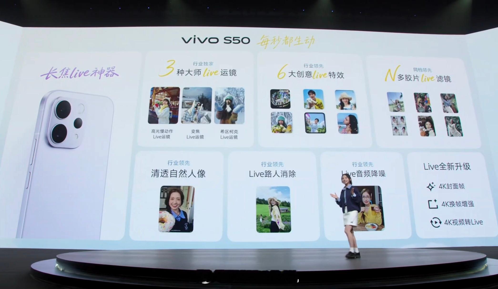 vivo S50的Super Live,蓝厂确实把live玩出花了啊!支持长焦live,而且是IMX882大底长焦,同价位这个潜望长焦是很强了live清透人像算法优化、路人消除、音频降噪3大live运镜、6大live特效,N多live胶片滤镜vivo s50