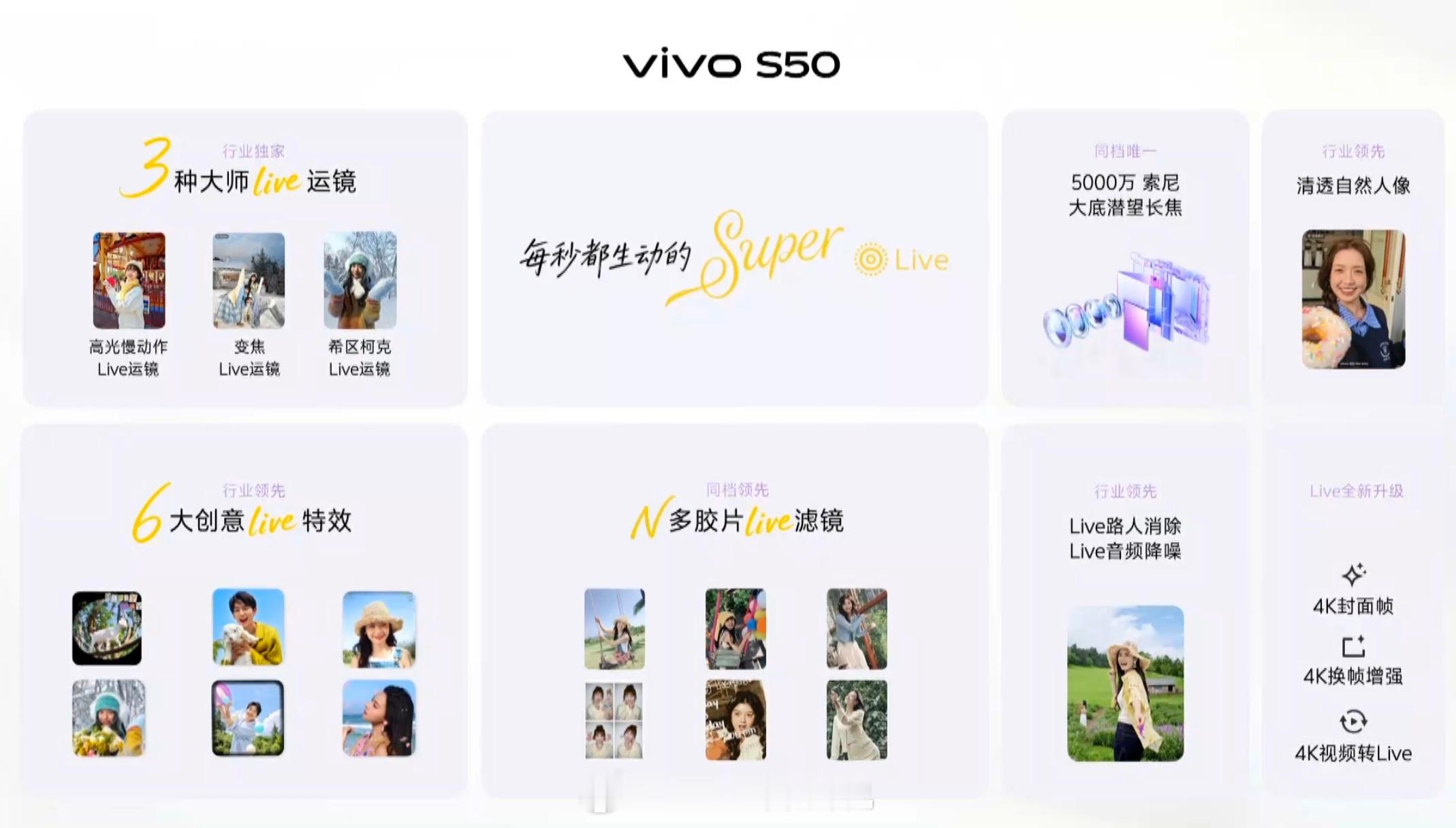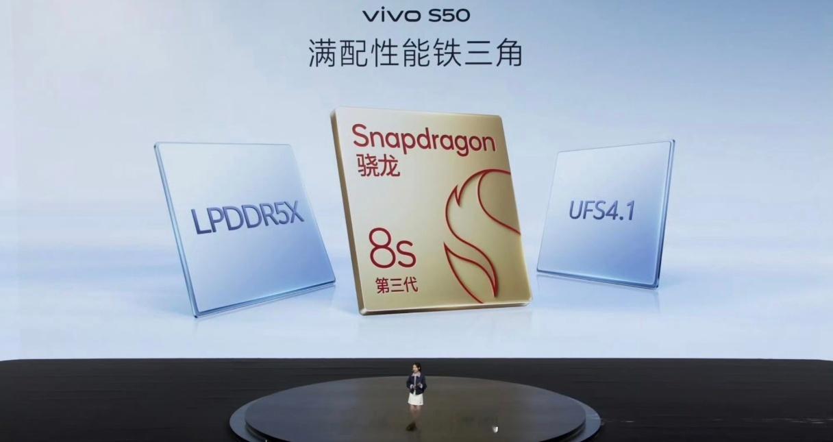 一张图看懂vivo S50的核心配置:第三代骁龙8s处理器,性能跑分超200万,是上一代的1.5倍6.59寸屏幕,峰值亮度5000nits,全局亮度1800nitslytia 700V主摄,IMX882潜望长焦(1/1.95英寸)6500电池+90W超充,超声波指纹识别2.0长焦live等各种live新玩法
