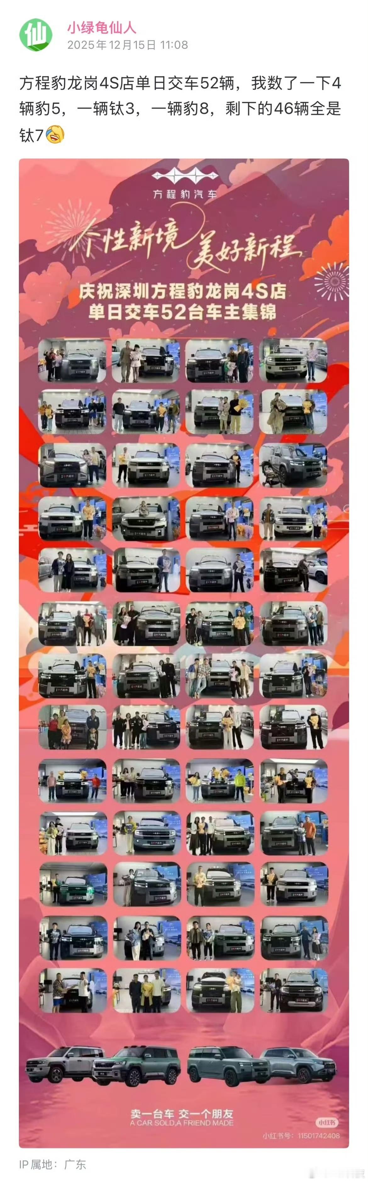 哇靠(`Δ´)!我买豹5的龙岗4S店单日交车52辆创造新纪录,4辆豹5,钛3、豹8各1辆,重点来了,46辆钛7!上次我豹5去二次保养,卖我车的销售说他手上几百个单忙到感冒了,生意巨好大家赶紧去买方程豹,真的好开好用方程豹