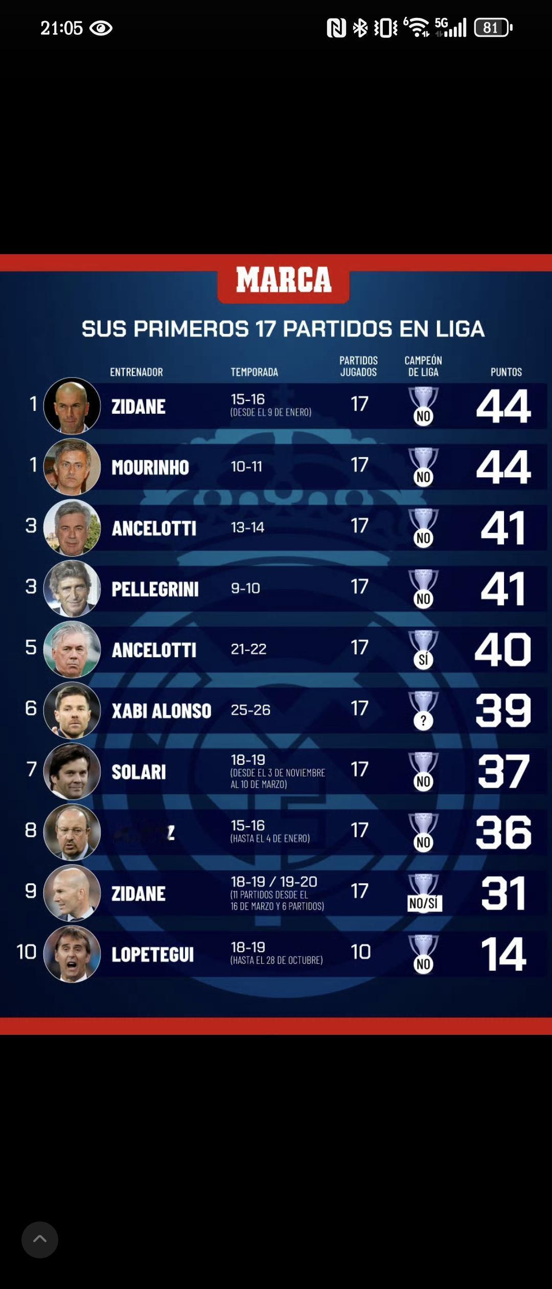 现在皇马17轮39分,在近代历史上还可以。 巴萨那边17轮43分,能在皇马历史进前三。 所以我得出结论阿隆索执教还行,是巴萨在西甲踢得太轻松,要是没输给皇马,他们都能直接夺冠了。 阿隆索要是下课,太冤枉,再给机会吧。[可怜]