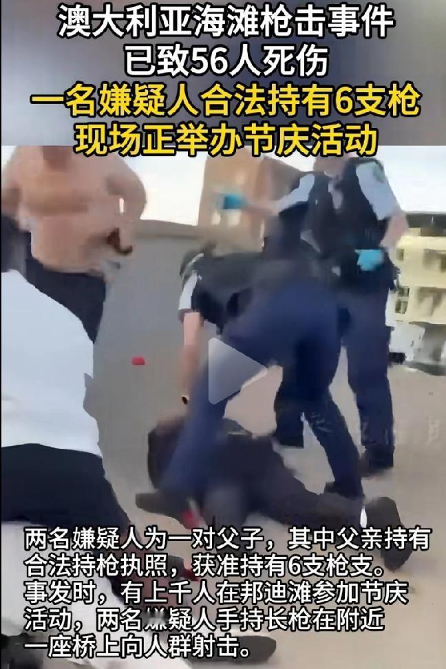 16死!40伤!澳大利亚悉尼邦迪海滩发生特大枪击案!时间定格在12月14日,当时这里聚集有上千人,正在举行一场庆祝犹太节日“光明节“活动!人们只顾着高兴,哪里知道死神正在悄悄靠近! 据悉,制造枪击案的是一对父子!他们手持多支枪械向载歌载舞的人群开枪!不过,有人爆料,开枪的父子不是胡乱射击,他们让现场的人不要惊慌,他们只杀以色列人!莫非这是一对反犹极端分子? 目前,两名嫌疑人中,一人在乱战中被打死,另一人被抓获,案件正在审理中! 澳洲枪击案 悉尼枪击事件 悉尼袭击事件 澳洲暴力事件 悉尼暴力事件 枪击悲剧
