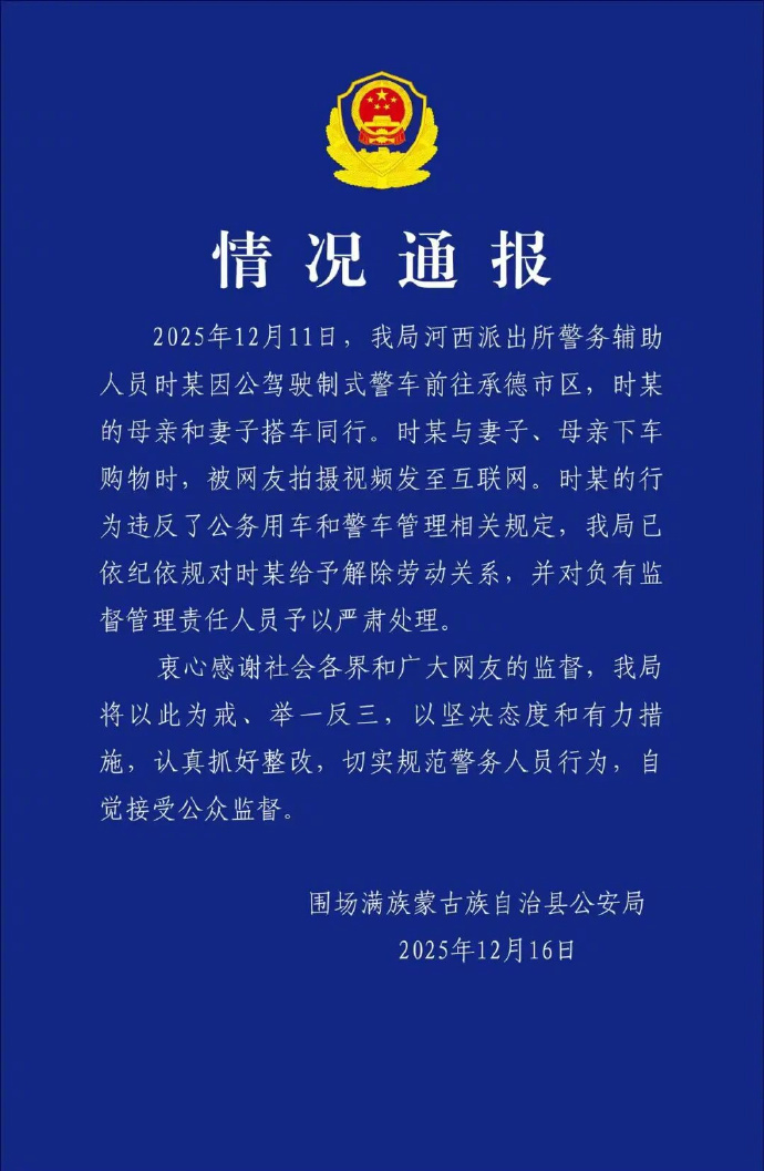 【#警方通报辅警用警车接送家人购物#】#警车私用涉事辅警被解除劳动关系# 河北省承德市围场满族蒙古族自治县公安局12月16日发布情况通报:12月11日,我局河西派出所警务辅助人员时某因公驾驶制式警车前往承德市区,时某的母亲和妻子搭车同行。时某与妻子、母亲下车购物时,被网友拍摄视频发至互联网。时某的行为违反了公务用车和警车管理相关规定,我局已依纪依规对时某给予解除劳动关系,并对负有监督管理责任人员予以严肃处理。据此前报道,近日,有网友向澎湃新闻反映,12月12日,河北省承德市承德县下板城镇文博天合园5号楼10号底商附近,一辆车牌为“冀H1288警”的警车疑似公车私用。视频显示,驾驶员与两名女子下车后径直走进一家水果店,三人均未着警服,其中一人还牵着一只宠物狗。#警车上下来3人未穿警服牵着宠物狗#