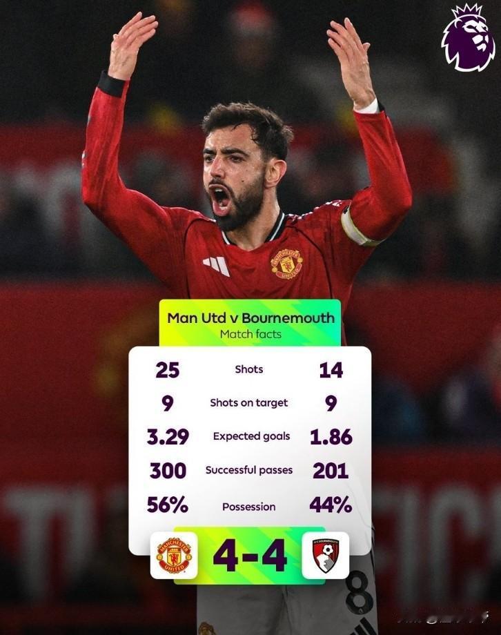 向阿森纳学习,曼联在掉链子的事情上也从不掉链子! 在本轮英超联赛中,曼联坐镇老特拉福德球场迎战6轮不胜的伯恩茅斯,上半场阿玛德率先破门曼联取得1-0领先,但是随后就被伯恩茅斯的塞梅尼奥破门1-1扳平比分,不过幸好卡塞米罗又建功曼联半场结束时2-1领先。 下半场曼联后防彻底失守伯恩茅斯连进2球3-2反超比分,这个时候队长B费站了出来,用一记任意球直接破门,随后库尼亚同样进球曼联连扳两球4-3反超比分,本以为曼联要拿下比赛了,万万没想到伯恩茅斯竟然在比赛第84分钟上演绝平,最终曼联4-4伯恩茅斯收获一场平局。 不得不说曼联这场比赛真的是跌宕起伏精彩刺激,让曼联球迷看得气的睡不着了,这样的比赛都没能赢球,真的是跟阿森纳学习了,在掉链子这件事上从来不掉链子,下一场对阵连胜的维拉不得惨败呀。
