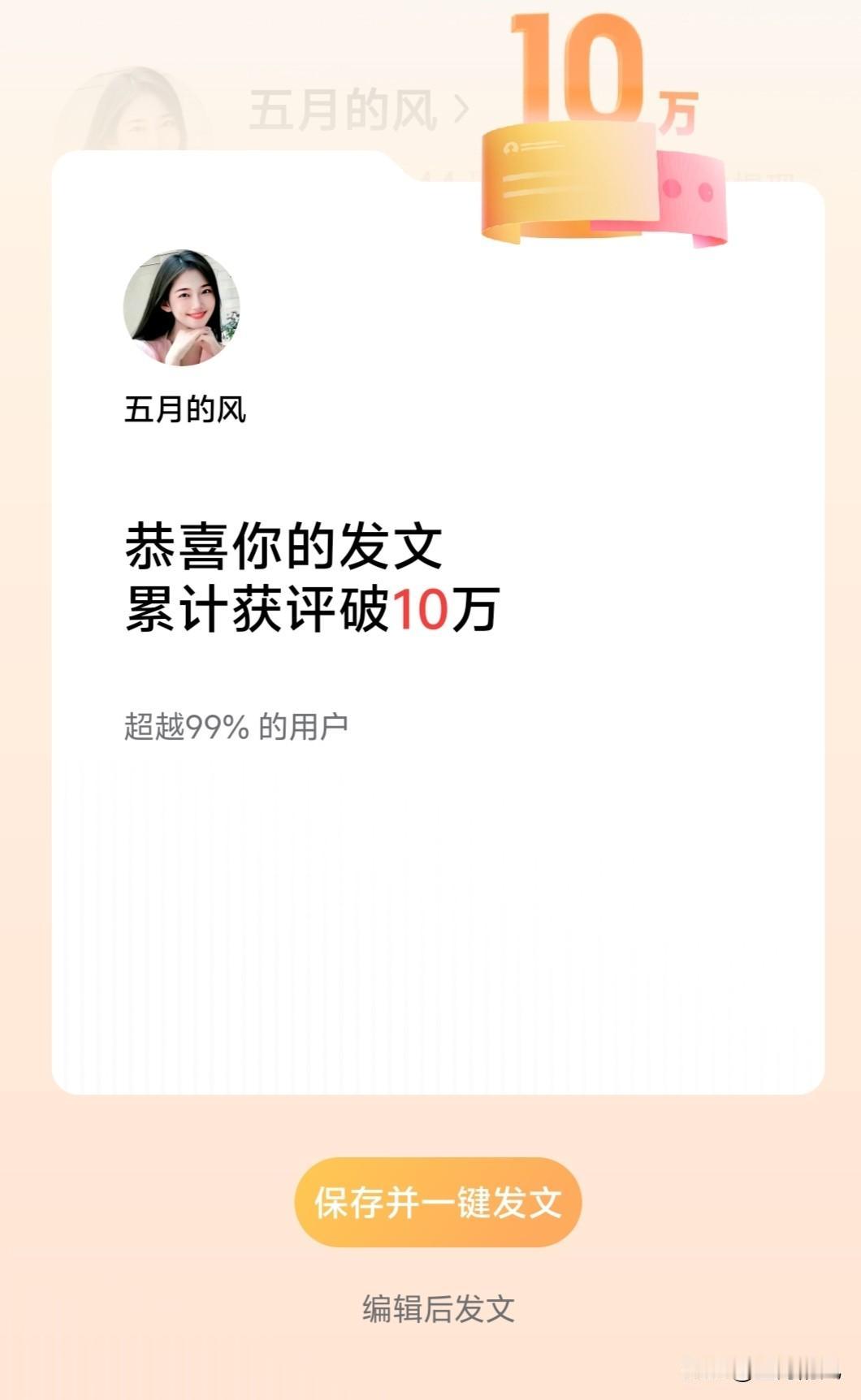 春风得意马蹄疾 一日看尽长安花 当屏幕弹出“累计获评破10万”的提示时 惊喜之余 我愣了好久 指尖甚至微微发颤 不知不觉 3年时间 2068个作品 4万粉丝 10万评论 30万点赞 是惊喜 更是沉甸甸的温暖 从最开始只是抱着分享生活的心情敲下文字 到如今收获十万份认可 这一路的点滴都历历在目 不积跬步 无以至千里 不积小流 无以成江海 每一条评论 每一次点赞 都不是冰冷的数字 而是素未谋面的网友递来的温柔 是你们的鼓励 让我在想放弃时坚持下笔 是你们的共鸣 让我知道平凡的碎碎念 也能被看见 被珍惜 送人玫瑰 手有余香 感谢每一次相遇与认可