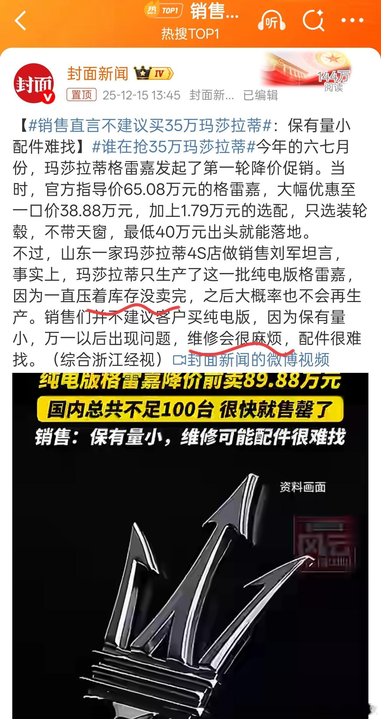 早,销售很聪明,话反着说反而有巨大流量如果说玛莎拉蒂数量有限先到先得就变成纯促销了,说不建议买反而收获巨大流量,让一些人蠢蠢欲动,35万买个三叉星辉照亮前行路好像也不错但这是23年库存车啊,马上都26年了,而且维修确实会很麻烦,听劝吧销售直言不建议买35万玛莎拉蒂
