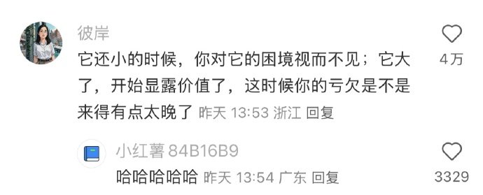 它还小的时候,你对它的困境视而不见;它大了,开始显露价值了,这时候你的亏欠是不是来得有点太晚了