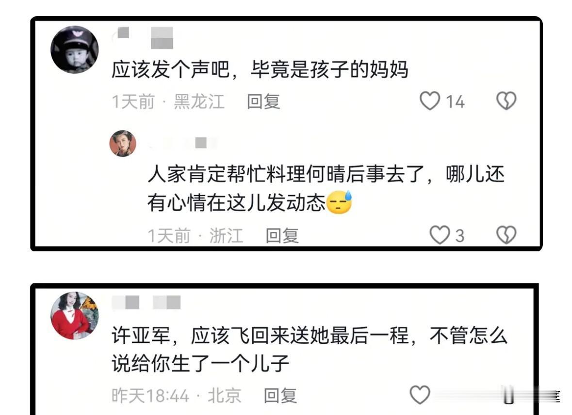 何晴离世后,前夫许亚军人设彻底崩塌?如今何晴已经火化,然而他的IP至今显示在美国。 许亚军和何晴在1995年相识,二人曾经也爱的不管不顾,双方经历了很多。他们不仅有多年的夫妻感情,还有一个共同的儿子。纵使后面离了婚,也一直当朋友相处。 按道理来说,双方之间拥有这样的情分,去送对方的最后一程也无可厚非。 然而,何晴离世后,许亚军却毫无动静。他人在美国,不发声,不祭奠的做法,让很多网友口诛笔伐!现如今,他的评论区都已经沦陷了…… 可 站在理性的角度,这事确实是网友们的道德绑架呀! 一方面,许亚军现在是在美国拍戏! 11月下旬,在美国的一些网友曾偶遇许亚军,双方还合影了,那时候他正在美国拍戏。 买一张来回机票回来,对于明星来说不算啥,但进组拍戏是有档期的。他一个人停下来,就意味着整个剧组都要停下来等他。从这点来说,许亚军不回来可能也是无奈之举。 另一方面:每个人表达的方式不一样! 有的人再难过也只是默默的伤心,不会发声说自己的私事。毕竟,不是每一个人都会将喜怒哀乐放在社交平台上。 最重要的一点就是: 他们只是前夫前妻的关系了,曾经再怎么好,都已经是过去式了。许亚军再婚后,已经有了新的生活。前妻过世,他说什么,做什么、怎么说、怎么做或许都有人诟病,索性什么也不说。 总的说来,每个人表达的方式不同!许亚军发不发声、回来祭不祭奠都是他的个人选择!大家没必要按照自己的意愿去强加给别人。或许,他也有自己的无奈呀!每个人都有自己的难处,看似光鲜的明星又何尝不是如此呢?