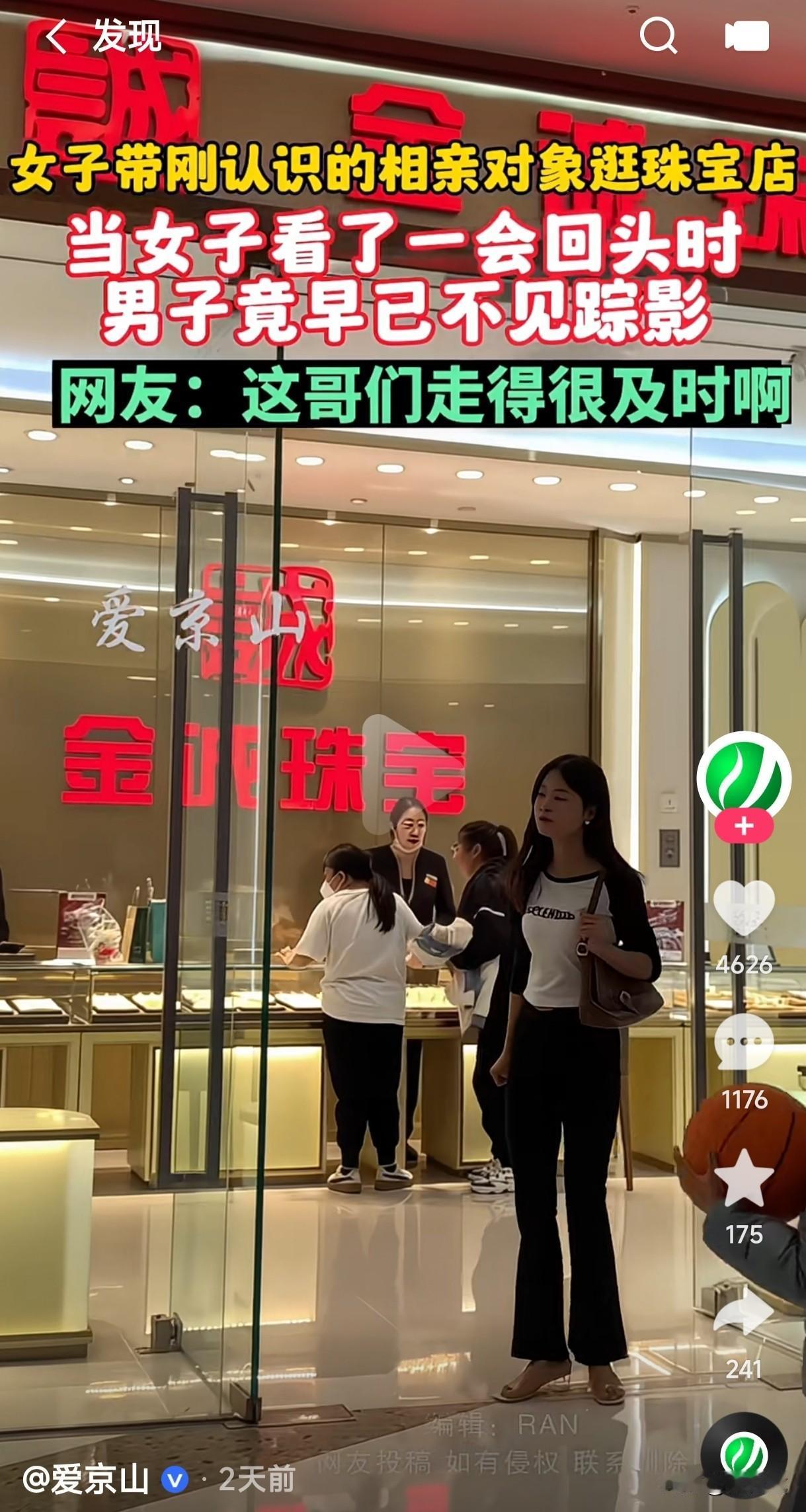 女子带刚认识的相亲对象逛珠宝店,当女子看了一会回头时发现男子早已不见踪影,这男子溜之大吉就是最明智的选择。 刚认识就去带人家男子逛珠宝店,你说你随便看看还能说的过去,你这是逛了一会看到心仪的珠宝了准备让男子买单吗?刚认识请你吃顿饭再随便去逛逛也就不错了,居然把他带进金店想宰他一下,这哪里是相亲对象,这不是把他当冤大头了吗? 幸亏这男子走的及时,若不走肯定又被你给坑惨了,认识没一会时间就买珠宝和衣服的,能有几个是真心的,无非都是为了自己的利益着想,现在的人傻子没有几个,这种鸡飞蛋打人才两空的事不是已经见怪不怪了吗?如果事情有了眉目那就是买房买车买珠宝自然而然不就水到渠成了,这种骗人的玩意还是趁早远离最好,要买她自己不掏钱买了吗?还找相亲对象干什么?
