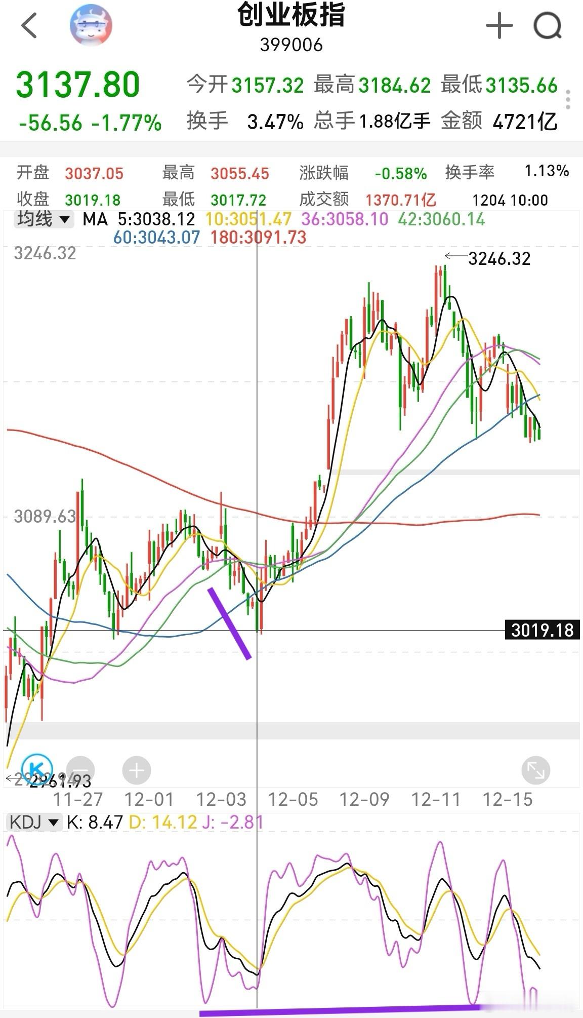 大家早!昨天市场缩量3100多亿,理论上今天要反弹一下,但美股微微回调,对A股没有刺激。创业板半小时kdj在低位,有点类似3号的走势。今天能高开,那么今天能反弹的概率在8成以上。如果低开,说明市场情绪比较差,主力在谋划挖坑,反弹就要择机减仓收拢资金。因为根据创业板现在的结构走势,会有日线极值,去二轮极值3048附近。我们要警惕回调,当下回落比反弹更丝滑!3166—3177目前成了压力。上证指数 跨年行情继续关注消费和商业航天。年底机构排名,操作难度大,多以短线为主。