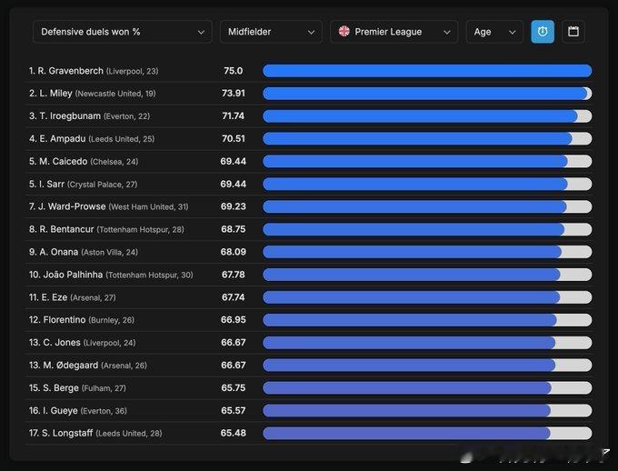 英超中场球员:防守对抗成功率◉ 75.0% — 格拉文贝赫(利物浦,23岁)◎ 73.91% — 迈利(纽卡斯尔,19岁)◎ 71.74% — 伊罗格布南姆(埃弗顿,22岁)◎ 70.51% — 阿姆帕杜(利兹联,25岁)◎ 69.44% — 凯塞多(切尔西,24岁)