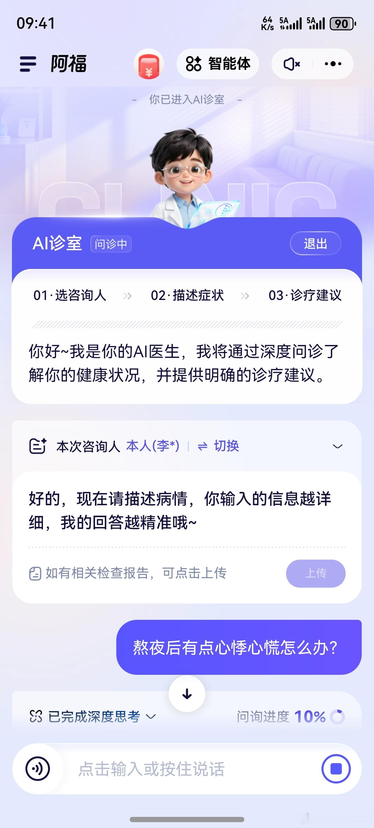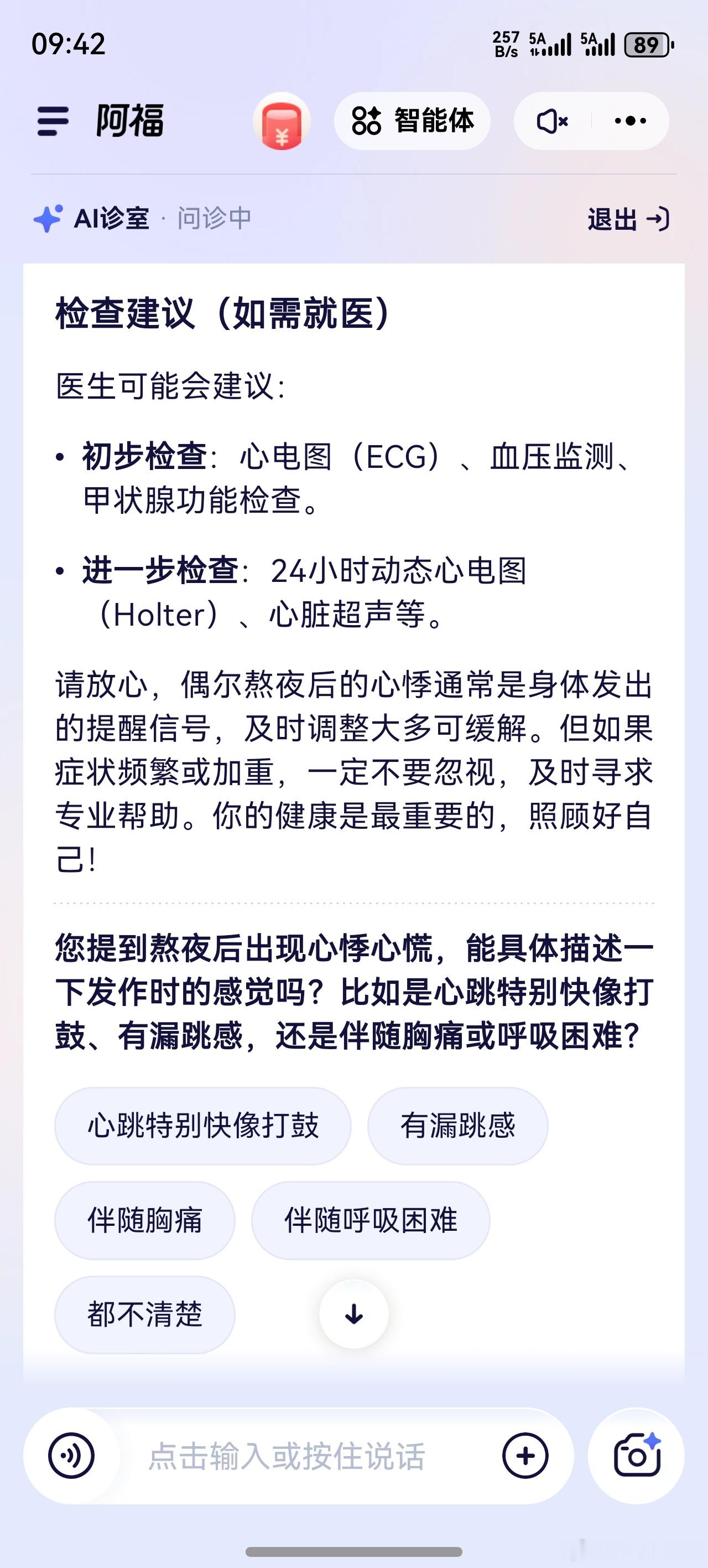 阿福治好了我的疑病症搁在以前熬夜后心跳得快两拍,都得抱着手机到处搜有没有事,越看越焦虑!之前也试过不少健康APP,花30多块买会员,问心跳快就给句可能是心律失常,建议就医的笼统答案,钱花了不说,反而更慌,等于没解决问题。现在用蚂蚁阿福就不一样了,上次又熬夜心悸,点开AI诊室,它没直接抛术语,反而一步步问:“熬夜到凌晨几点?有没有胸闷或头晕?”,最后说“是熬夜导致的神经兴奋,喝杯温蜂蜜水坐5分钟,明早补半小时觉就行”,瞬间就踏实了。不像那些收费APP只走流程,阿福是真的懂怎么帮人缓解焦虑,比花钱买不安靠谱太多了