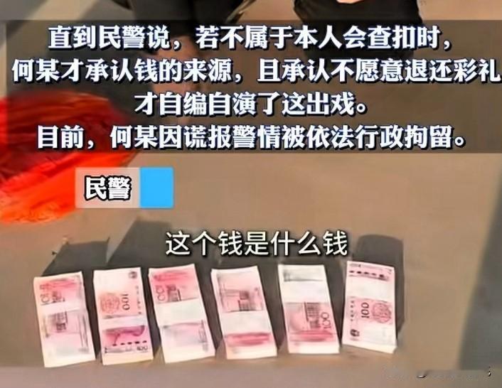自己挖坑埋自己! 云南一男子报警,26.8万彩礼被抢,谁知,警察一番调查取证,结局大出意外。 12月14日,曲靖的何某着急报警,电话里说话,快得像放机关枪,叭叭叭。 他胆战心惊地说,自己刚刚被人抢劫了,26.8万现金被抢走。 案情紧急,接警后,警察火速赶到何某出事现场。 何某看到警察,语无伦次,一会儿说丢了几十万,一会儿说是彩礼钱,又说什么4个人,还说吸烟后,人迷糊了。 警察让他别激动,一件事一件事的慢慢说,说清楚点。 通过何某的讲述,原来事情是这么回事。 何某这次手里26万8的巨款,不是他向别人借的,也不是自己出力赚的,而是家里的女儿订婚,女婿送过来的彩礼钱。 这彩礼,何某是不打算留下,原本只是想暂时替女儿保管,等女儿女婿正式结婚的时候,再给女儿带回去。 然后,又考虑到,这么大笔现金放在身边不安全。 于是,他开车去银行,准备把钱存起来先。 可没想到,他人还没到银行,在路上遇到4个人挡车问路,摇下车窗说了几句话,结果就出事了。 那4个人都留着短发,其中一个人个子高一点,但都没有胎记、痣什么的明显外貌特征。 何某说,虽然他有跟4人当中的高个子说过几句话,但因为自己没有出过远门,接触的人都是本地的,所以从口音上也听不出他们是哪里人。 后面,警察还问了一些发生抢劫时的具体细节,何某都是装傻充愣,说不记得了。 他说,因为在他没有防备的情况下,吸了抢劫犯递过来的一根烟,脑子就变的不灵光了。 他只记得,那4个人走后,他看了一眼副驾驶座,发现放在副驾驶位上装钱的包不见了,才后知后觉自己被抢劫。 对于何某的说辞,警察不置可否。着手调取了一路监控,这下有了重大发现。 监控中,除了看到何某本人提着一个小包上车,自始至终就没有旁人靠近车子,更别说有人打开车门拿走包裹。 警察让何某打开车门接受检查,没多久,警察从车内搜查到一个塑料包裹,打开一看是整整齐齐的一沓一沓钱。 警察指着钱问何某,这钱是怎么回事? 可笑的是,到这时候,何某还“死鸭子嘴硬”,企图蒙混过关。 看着摆在面前的钱,他小声说,自己头脑昏昏沉沉的,也不知道那钱是咋回事。 警察说,如果这钱,他说不出来路,那就带回去局里了。 这下,何某装不下去了。 “钱是我的,就是那彩礼。” 至此,一起所谓的抢劫案,迅速破案。 原来,不是真的有人胆子大,敢拦路抢劫,而是何某报假警。 何某被警察带走,依法行政拘留。 这件事发生后,大家都很疑惑,何某这么做为什么? 原因说出来,让人大跌眼球,同时何某也收获一波“问候”。 真是没见过这么幼稚,这么厚颜无耻的人。 说来说去,这一切还是因为钱,因为一个人的贪婪。 其实,何某当初拿到这几十万彩礼,早就欣喜若狂,想私自占有,根本不像他说的那样淡定,说什么只是替女儿暂时保管。 钱,他喜欢;可是,女婿他却看不上。 为了自己人财双得,让女婿人财两空,他自导自演出“彩礼被抢劫”的这场荒唐剧 ,还胆大的请了警察“友情演出”。 他幼稚地认为,撒谎称彩礼被别人抢走,他就即有借口悔婚,又可以瞒下巨款彩礼。 没想到,因为谎报案情触犯法律法规,最后,他反而把自己送去了警察局。 自己挖坑埋自己,聪明反被聪明误,说的就是何某这种人。 素材来源网络侵删