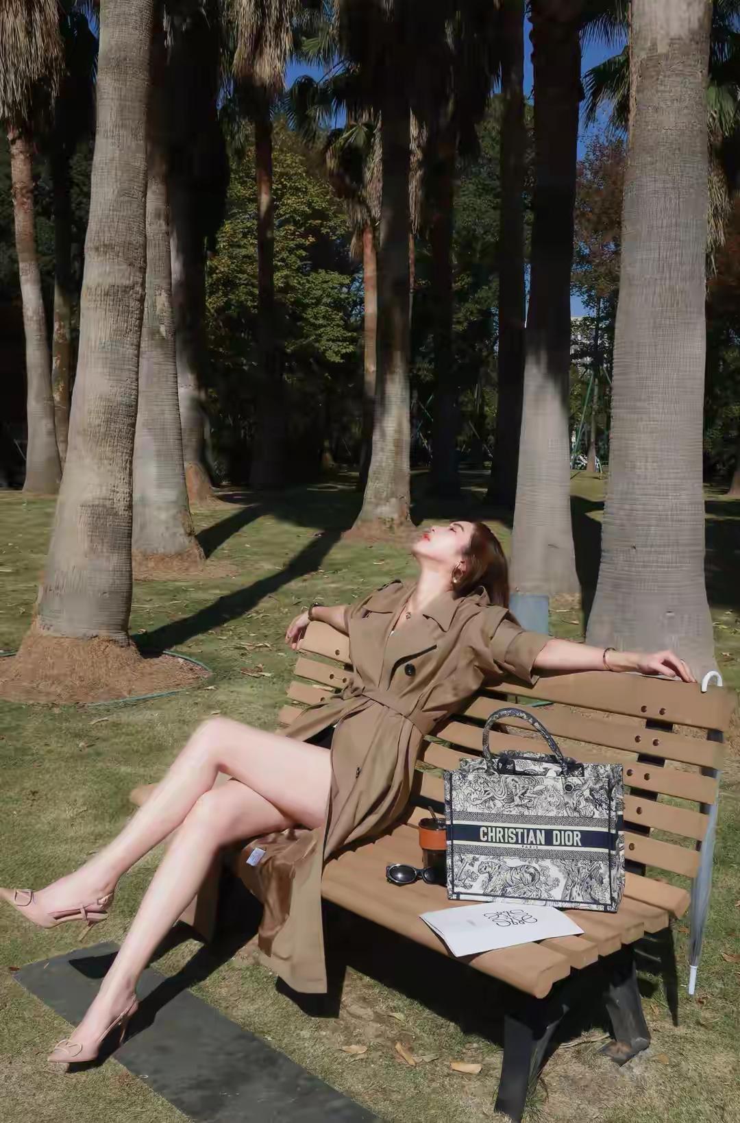 阳光明媚的午后,时尚女孩在公园长椅上享受咖啡时光。