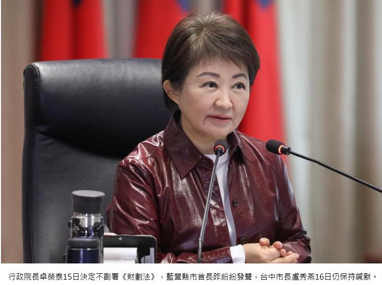 卓荣泰不副署财划法 蓝营县市首长纷纷发声痛批 卢秀燕却又沉默以对 台行政机构负责人卓荣泰 15 日宣布不副署立院三读通过的《财政收支划分法》,创下宪政首例,随即引发蓝营县市首长集体反弹,唯独台中市长安卢秀燕 16 日保持缄默,其态度分化引发外界关注。 卓荣泰的不副署决定公布后,蓝营县市首长迅速发声抨击。台北市长蒋万安直言此举将加剧行政与立院对立,强调应公布试算数字而非 “盖牌” 回避讨论,北市预估该决定将导致地方财政短少 250 亿至 300 亿元,影响捷运建设等重大民生工程; 桃园市长张善政、南投县长效淑华、云林县长效丽善更联合痛斥此举 “只有政治没有法治”,认为将损害地方财政稳定。 相较于蓝营同僚的激烈表态,台中市长安卢秀燕的沉默形成鲜明对比。16 日,卢秀燕出席市政会议时,媒体于会前、会后多次追询其对该事件的看法,但她均未回应,径直步入会场或快步离去。