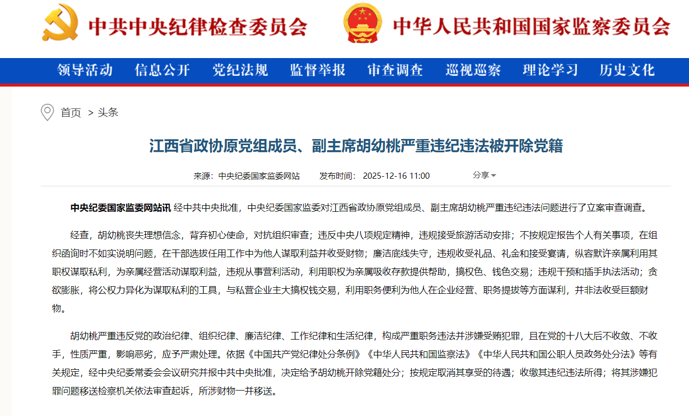 【江西省政协原党组成员、副主席#胡幼桃被开除党籍#】#胡幼桃被通报搞权色钱色交易# 据中央纪委国家监委网站消息:经中共中央批准,中央纪委国家监委对江西省政协原党组成员、副主席胡幼桃严重违纪违法问题进行了立案审查调查。 经查,胡幼桃丧失理想信念,背弃初心使命,对抗组织审查;违反中央八项规定精神,违规接受旅游活动安排;不按规定报告个人有关事项,在组织函询时不如实说明问题,在干部选拔任用工作中为他人谋取利益并收受财物;廉洁底线失守,违规收受礼品、礼金和接受宴请,纵容默许亲属利用其职权谋取私利,为亲属经营活动谋取利益,违规从事营利活动,利用职权为亲属吸收存款提供帮助,搞权色、钱色交易;违规干预和插手执法活动;贪欲膨胀,将公权力异化为谋取私利的工具,与私营企业主大搞权钱交易,利用职务便利为他人在企业经营、职务提拔等方面谋利,并非法收受巨额财物。 胡幼桃严重违反党的政治纪律、组织纪律、廉洁纪律、工作纪律和生活纪律,构成严重职务违法并涉嫌受贿犯罪,且在党的十八大后不收敛、不收手,性质严重,影响恶劣,应予严肃处理。依据《中国共产党纪律处分条例》《中华人民共和国监察法》《中华人民共和国公职人员政务处分法》等有关规定,经中央纪委常委会会议研究并报中共中央批准,决定给予胡幼桃开除党籍处分;按规定取消其享受的待遇;收缴其违纪违法所得;将其涉嫌犯罪问题移送检察机关依法审查起诉,所涉财物一并移送。