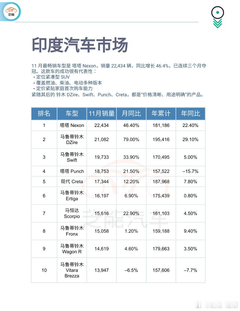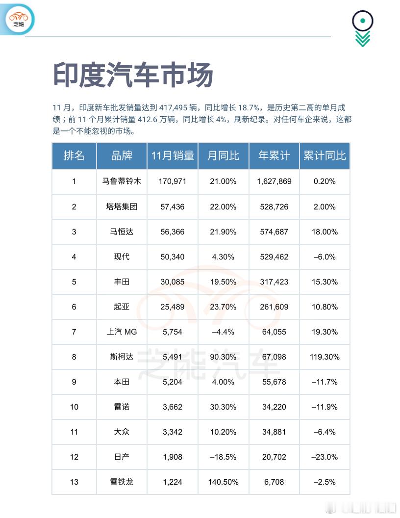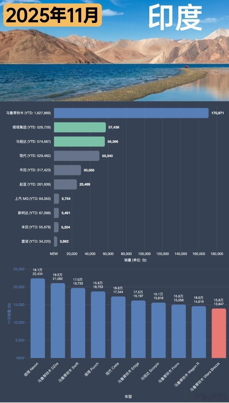 印度车市体量不小,11 月销量再创新高,增长势头很猛,是全球车企都不敢忽视的市场。品牌格局特别稳固,前三家就拿走了近七成份额,本土和日系品牌优势明显。税制改革直接带动了小型车和紧凑型 SUV 的需求,这里消费者对价格很敏感,实用、空间够的车型比智能化配置更吃香。中国品牌存在感不强,只有 MG 有一定规模但增长放缓,政策和本地化的高门槛,让不少车企都难进入~