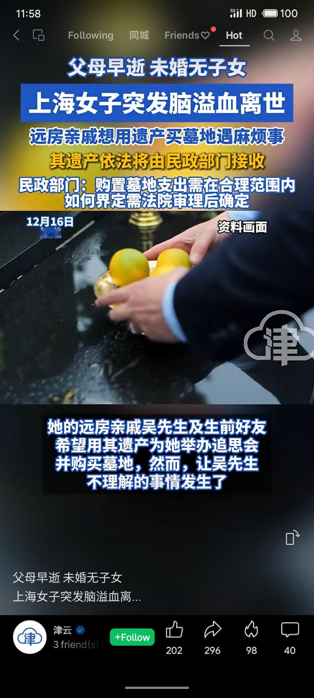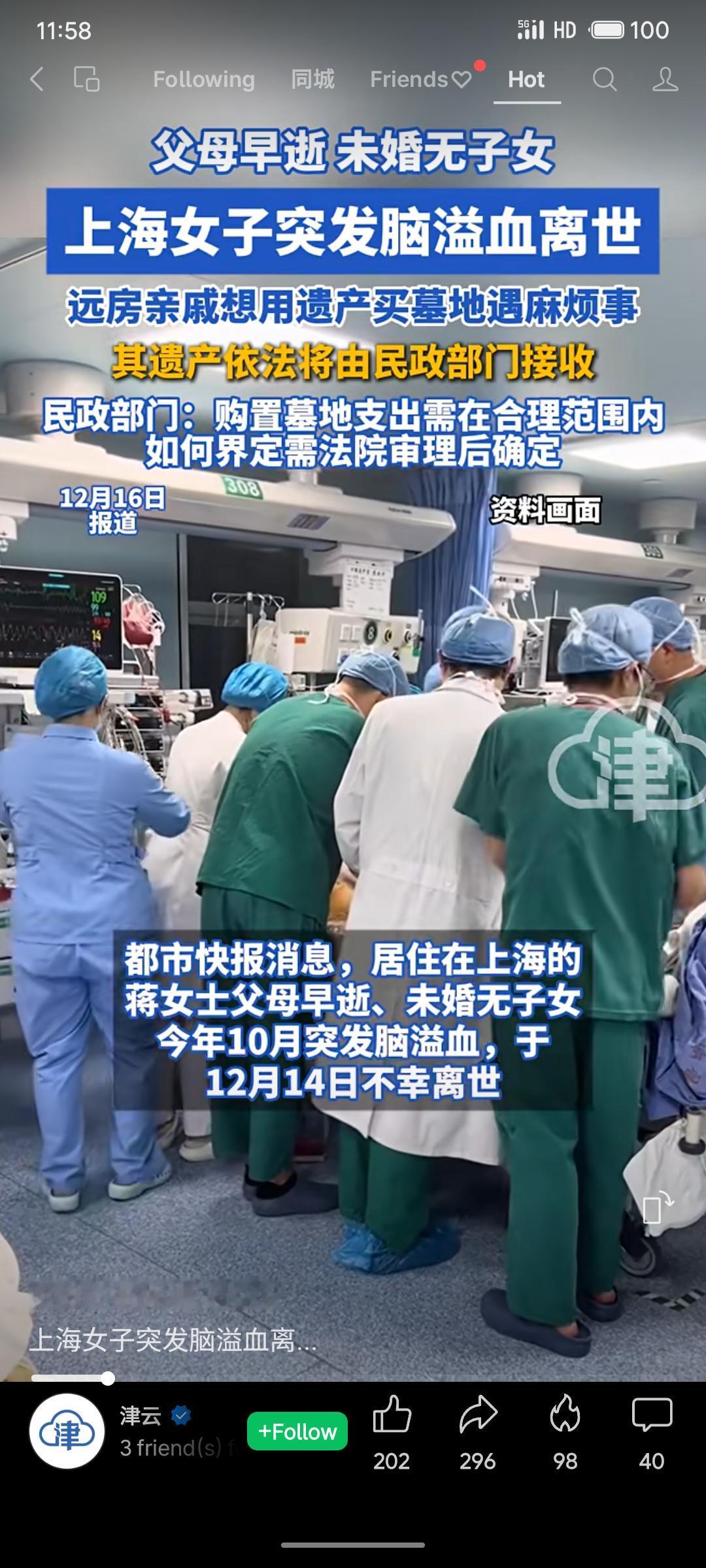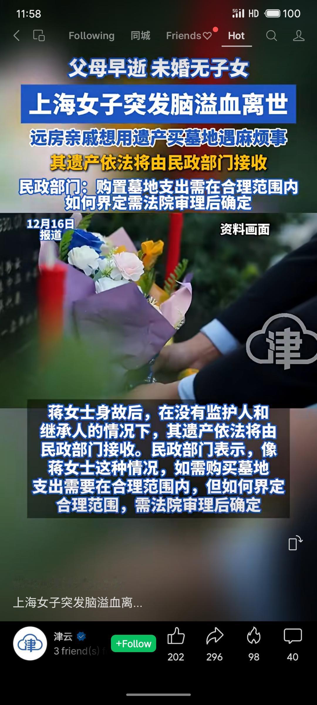 上海一未婚无子女女子突发脑溢血去世,其遗产依法将由民政部门接收。远房亲属希望用遗产为其购置墓地,却面临支出需“合理”且界定权在法院的困境。此事凸显了非传统家庭结构下,遗产处理在法理与情理间的真空,相关制度需更具温度与可操作性。