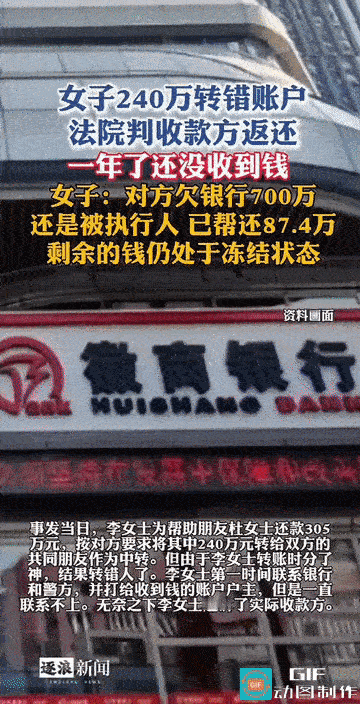 “这就是大意的代价吗?”浙江宁波,一女子在转账时,因为一边打电话一边操作手机银行,在确认转账的瞬间甚至没注意到屏幕上出现的姓氏和账号与她真正要转的人完全不同,导致这240万元直接转错了。更要命的是这人还是被执行人,就连她的收款账户都被银行申请冻结了,如今快一年了,这笔钱还没有要回来! 来源:【逐浪新闻】 去年12月26日,李女士需要向一位单名“莹”的朋友转账240万元,这笔钱是她借给朋友杜大姐用于还债的部分款项! 转账过程中,李女士同时接听着电话,注意力被分散。在手机银行输入“莹”字选择收款人时,系统自动匹配到了一个曾经认识的、名字中同样带有“莹”字的联系人,但此人与李女士原本要转账的对象姓氏不同! 疏忽导致错误,李女士在未仔细核对收款人全名和银行卡号的情况下,分三笔将240万元转出。转账后,她才从原本要收款的朋友那里得知对方并未收到钱款! 李女士发现转账错误后,第一时间试图联系收款人尹某,但对方电话始终无法接通,后来甚至直接停机,处于失联状态! 令李女士万万没想到的是,尹某的债务状况远超她的想象。据了解,尹某是一名个人经营性贷款逾期客户,仅在一家银行的本金逾期就超过700万元。由于未能偿还多家银行及个人的债务,她的银行账户早已被多家法院先行查封冻结! 李女士的追讨之路陷入困境。她迅速联系银行并报警,但银行方面表示转账一旦成功就无法撤销拦截,建议她自行与收款人协商或通过法律途径解决。无奈之下,李女士只能将尹某告上法庭! 今年2月,法院经审理后作出判决,认定尹某收取李女士240万元属于“不当得利”,判令其返还全部款项! 但判决执行过程中,李女士遇到了更大障碍。尹某的账户早已因其他债务纠纷被法院冻结,李女士的240万元转入后,其中87.4万元在今年2月被鄞州法院划扣,用于清偿尹某的其他债务! 针对账户内剩余款项的执行问题,法院于今年11月11日作出裁定,明确指出由于其他债权人对尹某账户的查封冻结在先,李女士的权利不能对抗先行的强制执行,因此驳回了她的执行异议! 目前,李女士已提起执行异议之诉,案件尚未开庭审理。她的手机里仍然保存着那三笔转账记录,等待着一个可能遥遥无期的结果! 法院的判决和执行裁定书堆在案头,她反复查看这些文件,试图从法律条文间找到一线希望。对于李女士来说,这场由一次疏忽引发的法律纠纷,或许才刚刚进入最艰难的阶段!