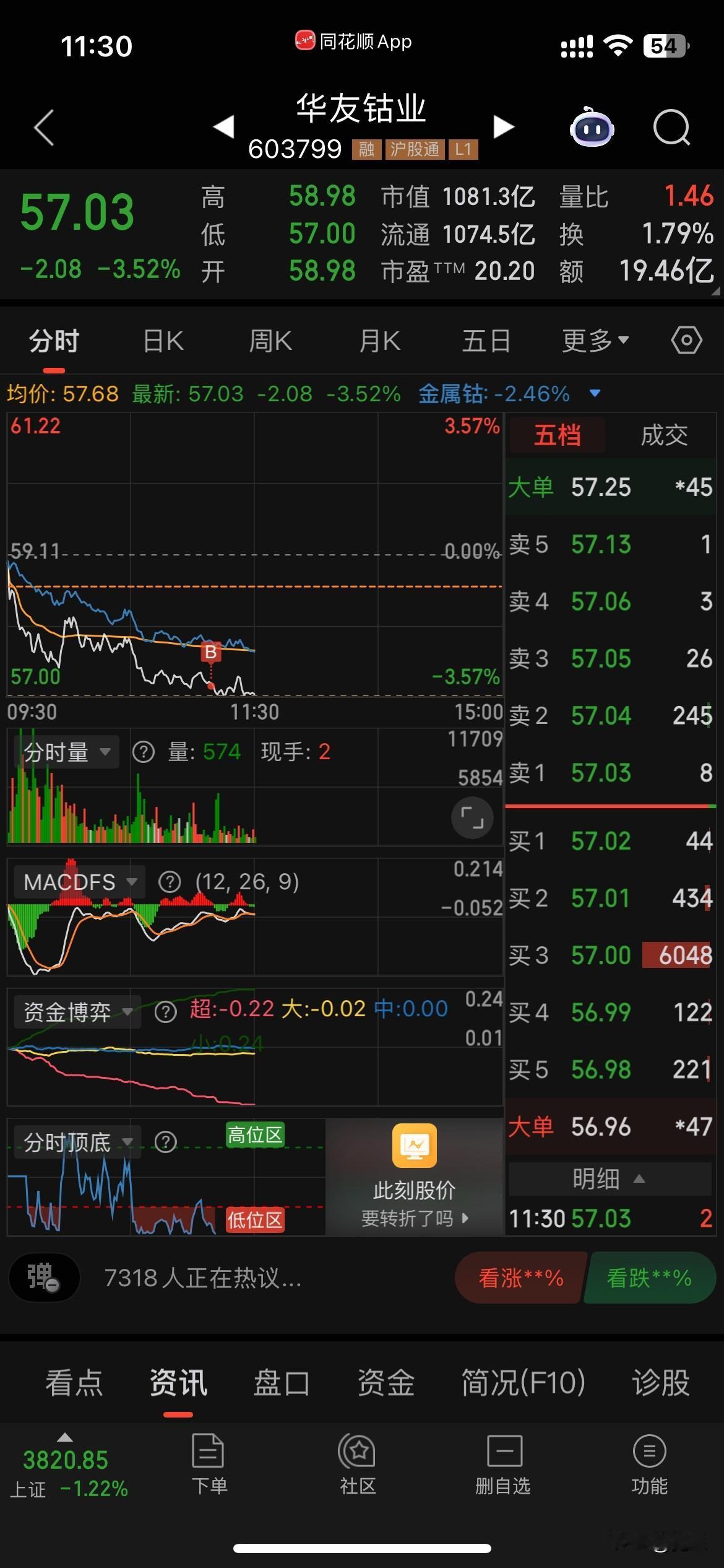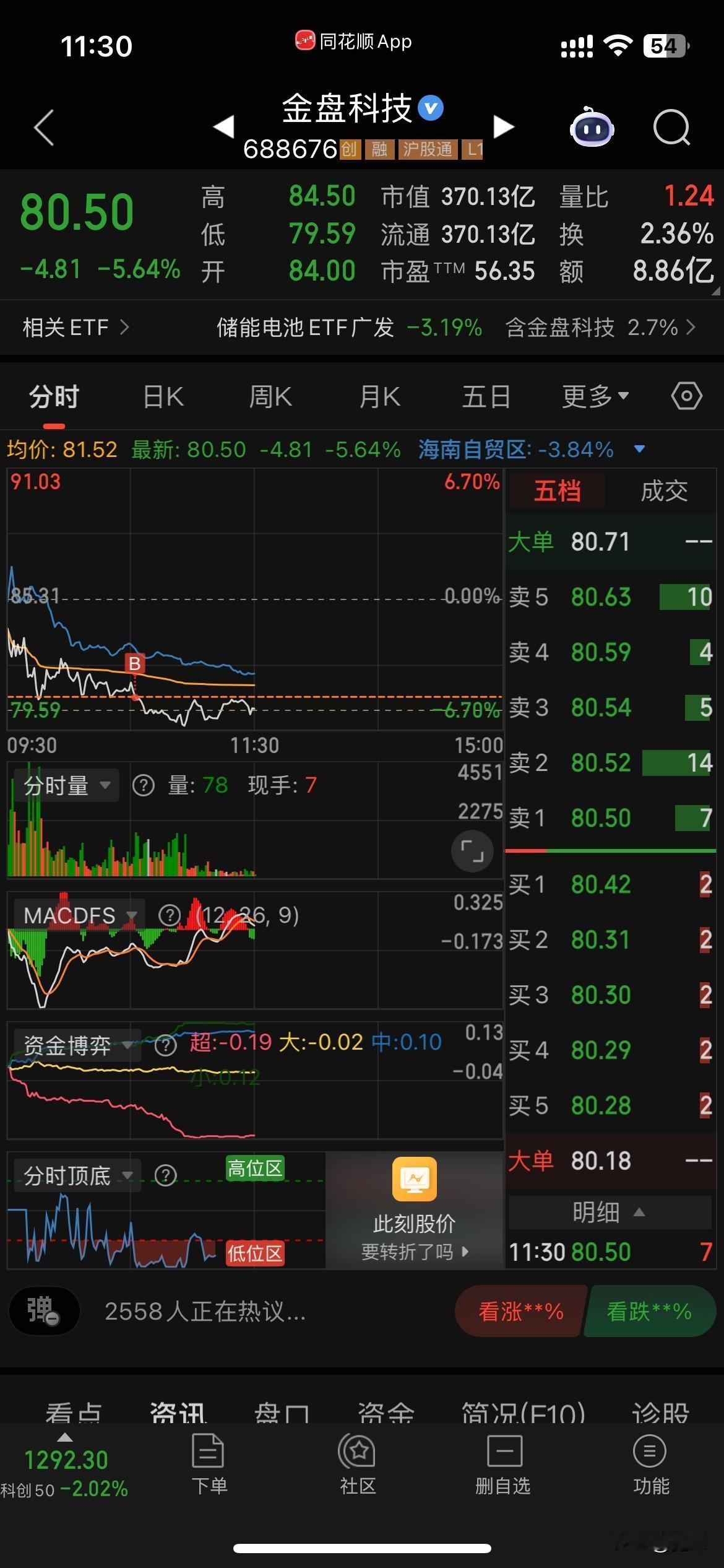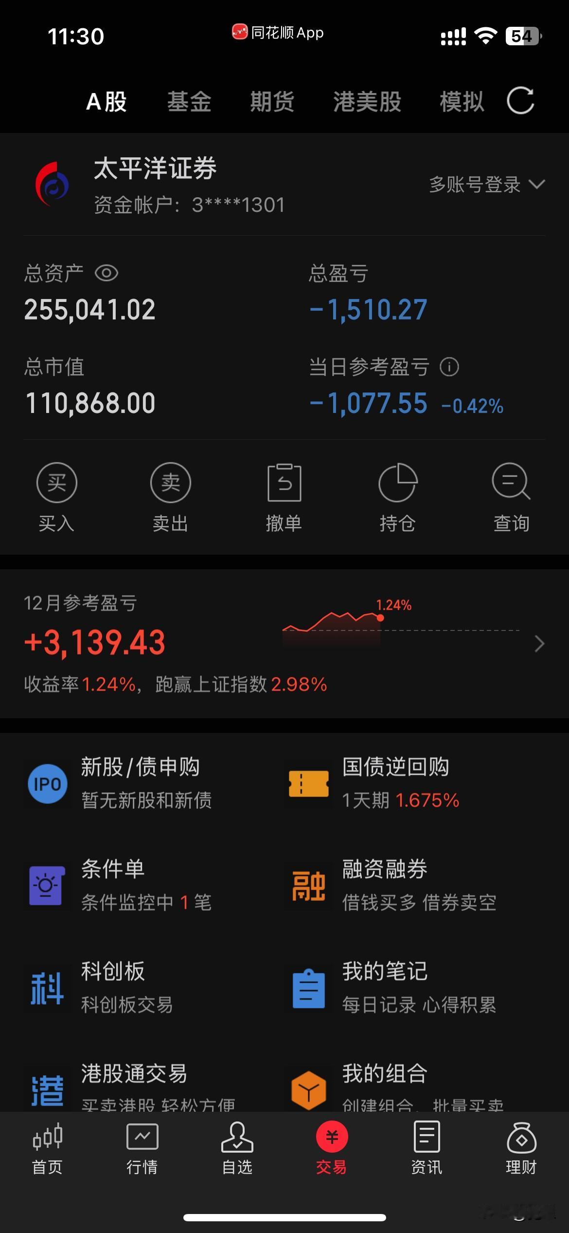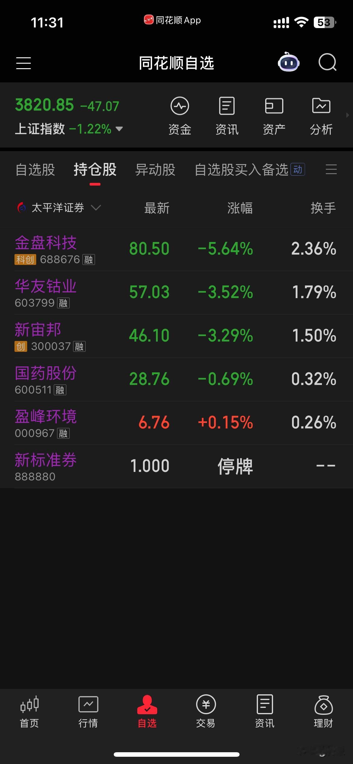上午大盘一泻千里,毫无抵抗,弱势尽显。我也不能幸免。好在有盈峰撑住了门面,跌得不是很多。盈峰红盘时卖了1/3,低位斗胆加仓了华友和宙邦。马上海南就要封关,重新买入了金盘。大盘跌这么多了,总不会没有反弹吧。如果下午反弹就把华友和宙邦做T出掉。上午亏1千多点。这个月操盘异常困难😓。