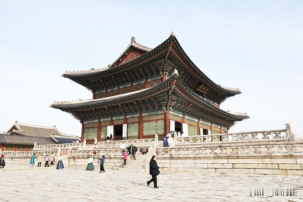 韩国故宫——景福宫 景福宫,始建于1395年,是朝鲜王朝(1392-1910年)的正宫,位于首尔市中心。其名称取自中国《诗经》中的“君子万年,介尔景福”一句,建筑格局仿照明代皇宫,但规模较小,体现了朝鲜作为中国藩属国的等级制度。景福宫为首尔五大宫之首,现存建筑群包括交泰殿、慈庆殿等,并定期举行传统守卫仪式表演。