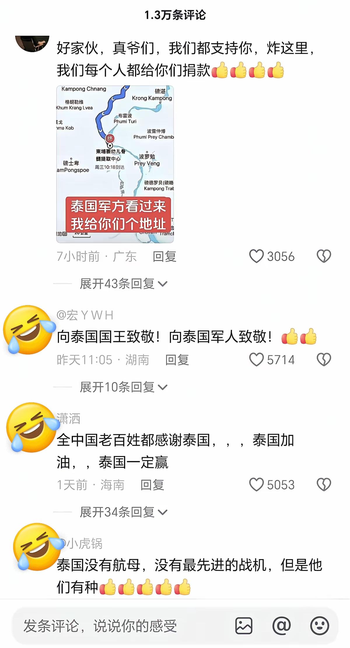 泰国抖音官方号下面的评论,地图上找了一下,是真的有这么个地方,地名还是中文标注的,不禁让人后背发凉;首先我们和柬埔寨与泰国关系都可以,我们在东盟内部问题上绝不会选边站,但是在打击反诈问题上,只要跟我们唱反调的,都是我们的敌人。 泰国柬埔寨冲突