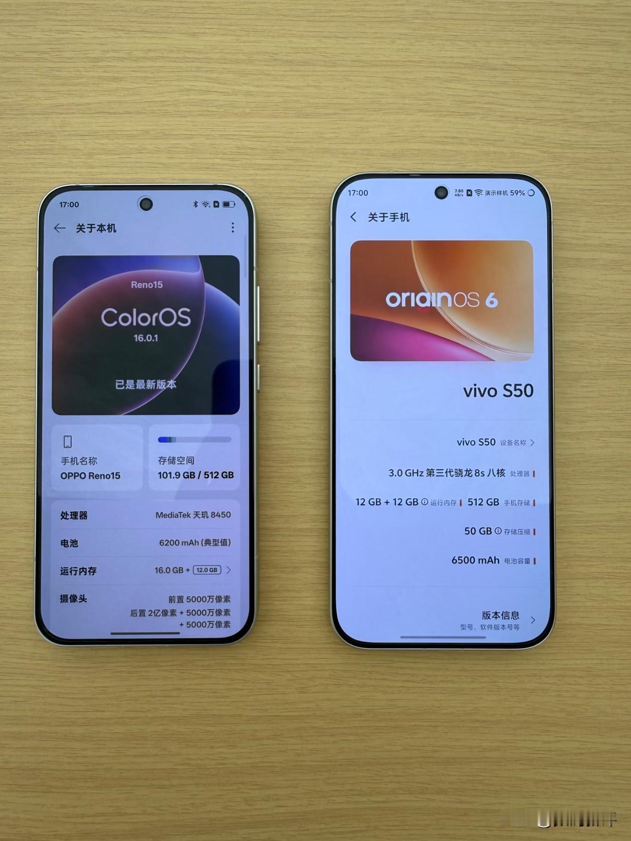 OPPOReno15和vivoS50谁更好看[奸笑]外观上都很像啊,都是充满了果味!果然主打颜值潮流的机型,外观是最重要的,无论是配色还是镜头模组都是紧跟潮流,尺寸是Reno15更小,S50机身是6.59英寸,看起来略大一点,一个天玑8450,一个骁龙8sGen3处理器,价位段也是一致的[泪奔]