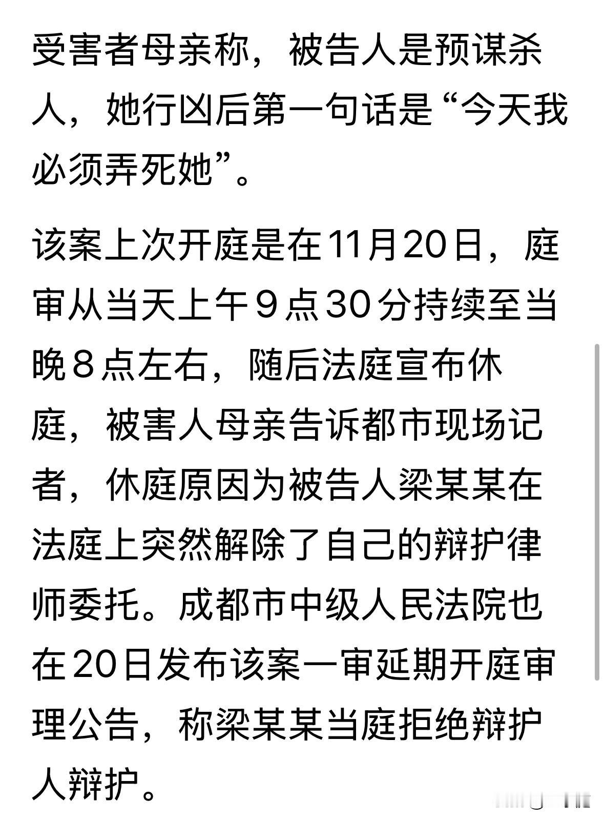 罪犯梁珂莹在一审开庭时,千方百计要求换律师。结果,让人意外的是这次她用的居然是法律援助律师。 2024年6月9日,三十多岁的单身女子梁珂莹来到了住在同一个小区的王紫雅家门口。双方并不相识,结果,168厘米身高的王紫雅,被1米5的小个子梁珂莹持刀杀害! 事后,梁珂莹被鉴定出了精神分裂症。 2025年11月20日,案子开庭了。据媒体报道,庭审之上梁珂莹能逻辑清晰的辩解,口口声声否认她患有精神病,之所以去王紫雅家敲门是想询问隔壁的房子租多少钱一个月。 当天庭审持续了十几个小时,最终,不得已中止,因为梁珂莹不认可她的辩护律师,强烈要求更换律师。 时隔近一个月,该案在今日二次开庭。令人意想不到的是,这次梁珂莹的辩护律师居然是法律援助律师。也就是说,对方是不收取任何费用,免费替她辩护的。 如此一来,还真的让人有些搞不懂了!按道理来说,她是家中独女,父母是退休教师,家中经济尚可,请个辩护律师是不成问题的。 她在庭审上千方百计要求更换成援助律师,到底意欲何为呢?是想拖延时间,还是想为自己家省点开支?这点,或许只有她自家人才清楚了。 只是,不管如何,始终心疼无辜的王紫雅!她与她都不认识,结果生命却在自家门口永远被定格了![流泪]