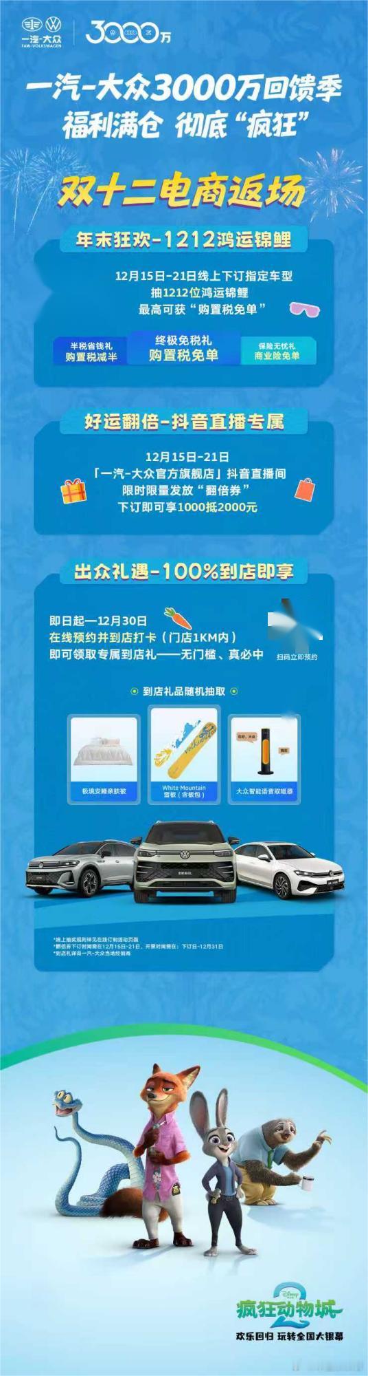 一汽-大众年底福利加码,“3000 万回馈季”返场一汽-大众最近又在发福利了。围绕“3000 万辆整车下线”这个节点,一汽-大众大众品牌的回馈活动迎来“限时返场”,活动时间直接延续到 12 月 31 日。返场期间新增了两项玩法。一是线上下订指定车型,可参与 1212 份抽奖,最高可获得购置税免单;二是“一汽-大众官方旗舰店”限量发放 280 份下订 1000 抵 2000 的好运翻倍券。重要的是,原本的核心权益也还在,比如燃油车可享至高“三终身”用车保障和最长 5 年 0 息金融方案,老车主回店试驾或增换购也有对应回馈。此外,到店打卡还能 100% 领取一份随机礼品,不设门槛。整体看下来,这次返场更像是一次年底购车窗口期的福利补充,没有复杂规则,时间点也比较明确。如果正好有购车计划,可以关注一下。一汽-大众 (原创/欢欢)