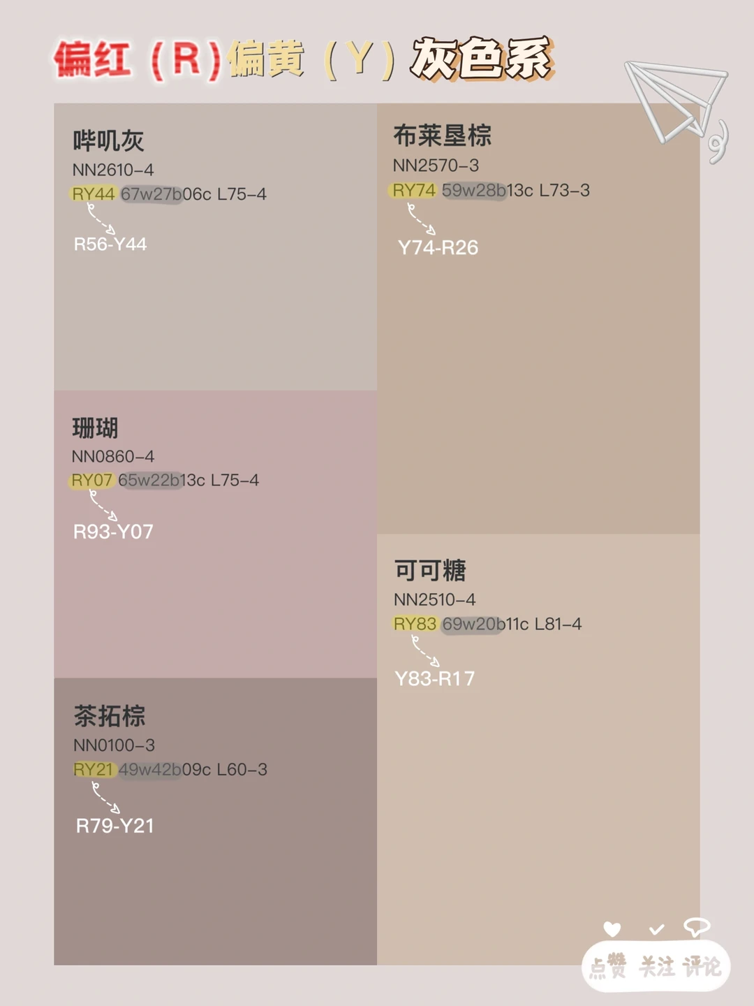 偏黄(Y)或偏红(R)的颜色并且中等黑度(b)看起来灰一些的颜色,比较适合打造法式轻复古的装修风格。比如:布莱垦棕、可可糖、哔叽灰、珊瑚、茶拓棕