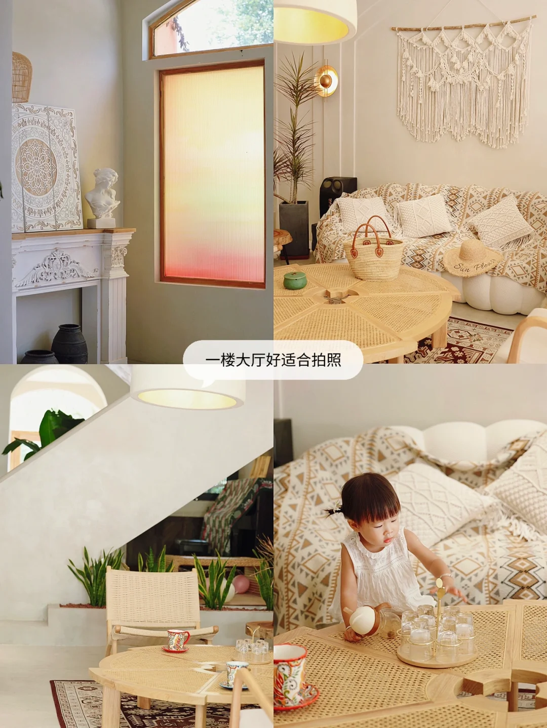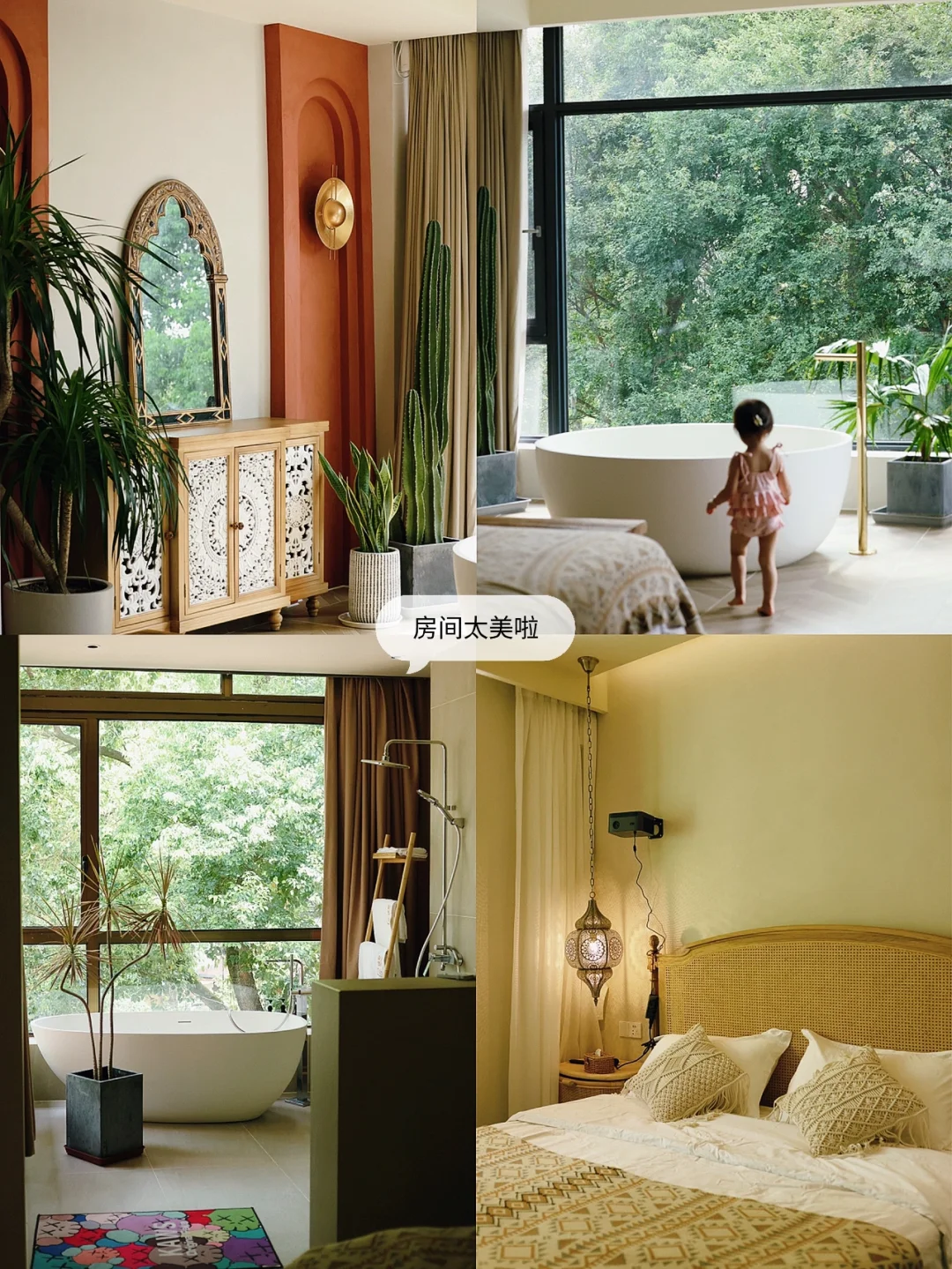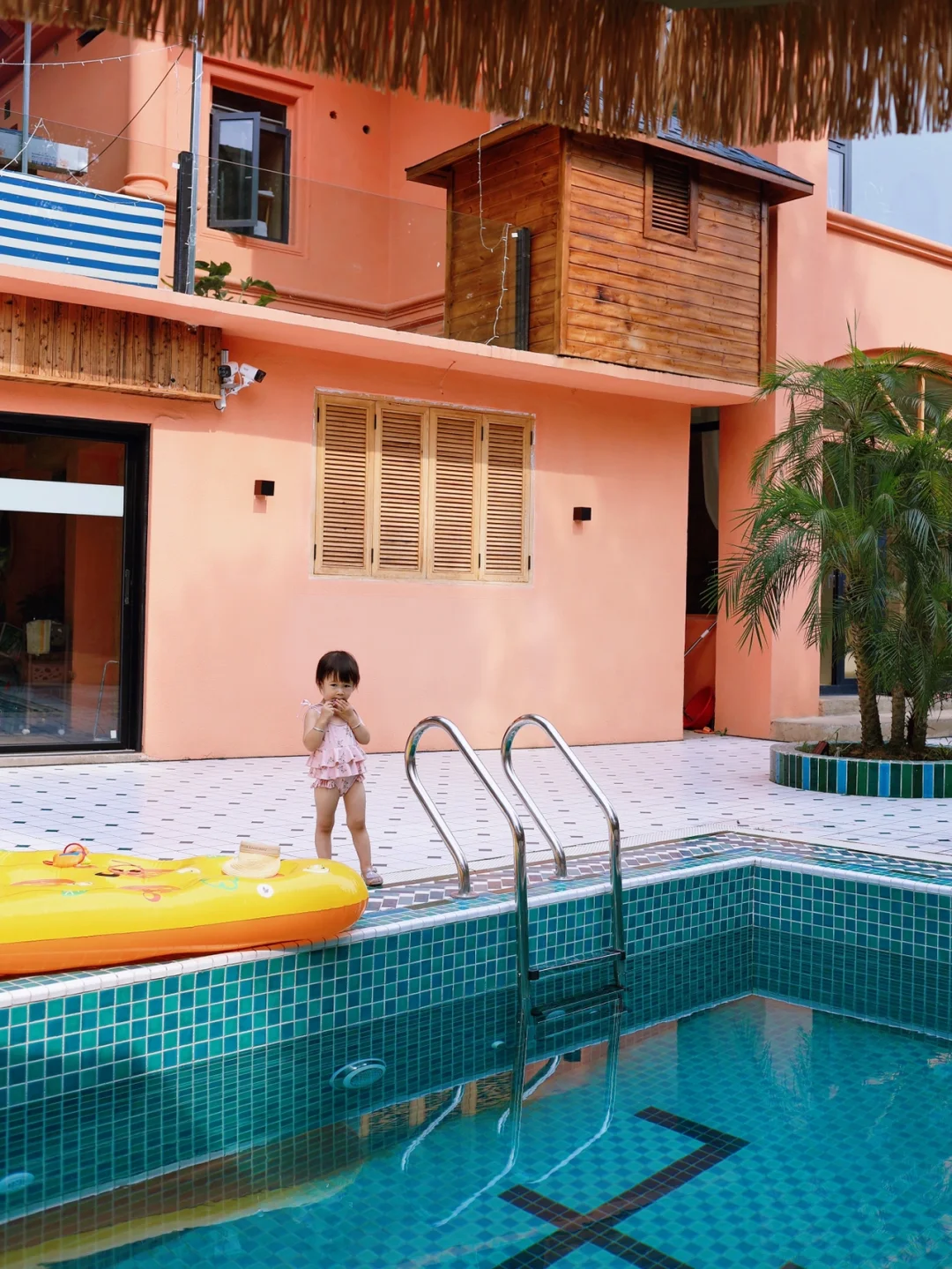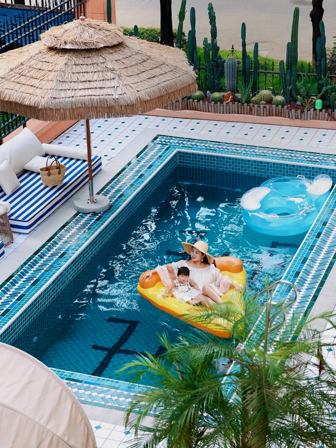 🍕院子里的泳池特别出片,也很适合小盆友玩水,漂在游泳圈上,悠闲的享受假期时光,真的很舒服~这是一个有三层楼的小院子,绿植环绕,环境清幽,一共六间房,很适合团建或是办生日party🥳也很适合大家庭过来度假🏖整个风格就是摩洛哥度假风,每个角落都可以随手出大片📷
