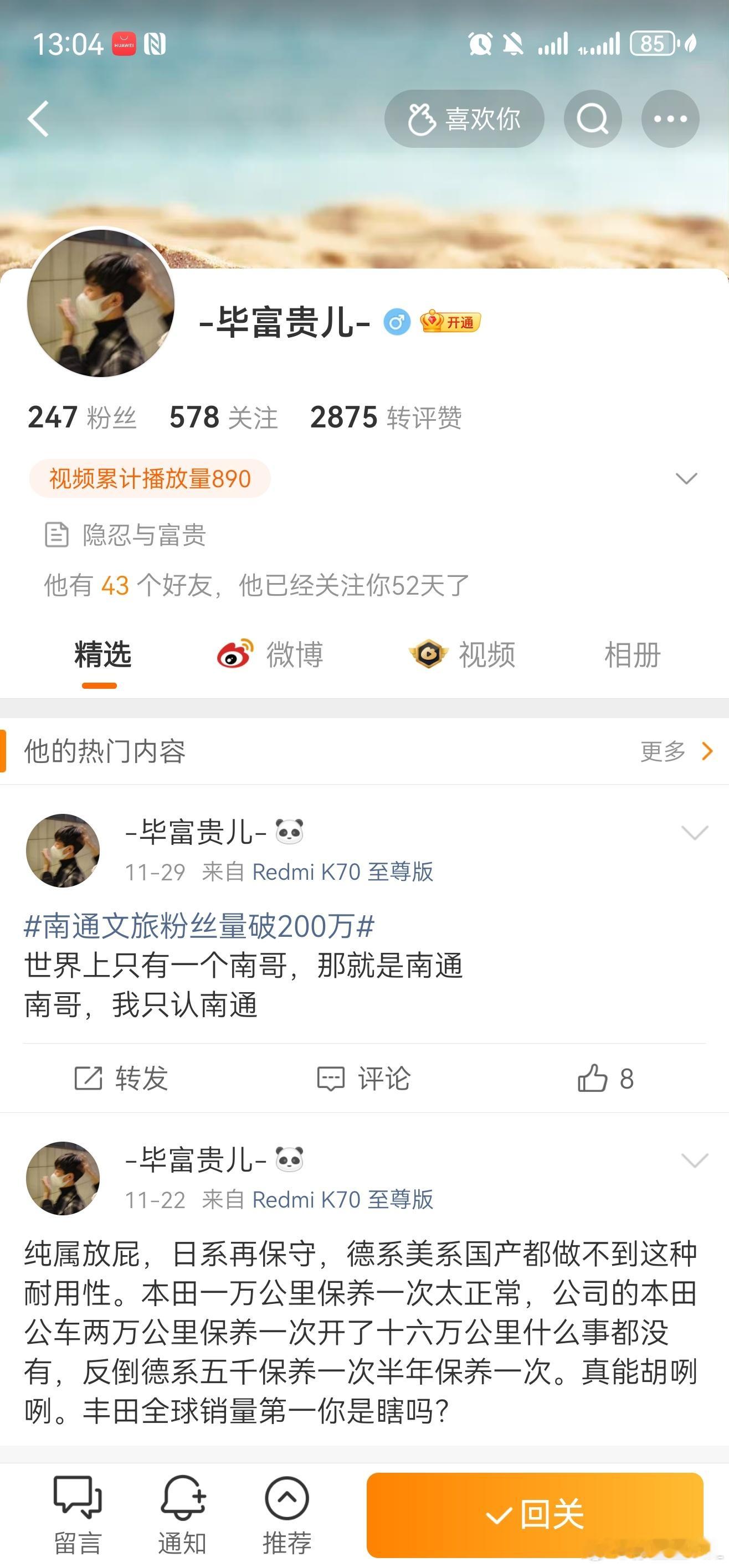 这都啥人啊...我发了个高速能耗。上面写着平均时速85。这哥们来了句,高速上跑85。