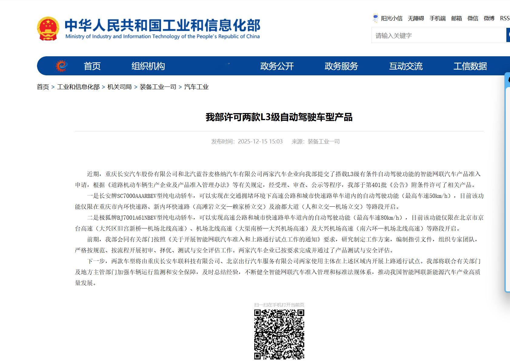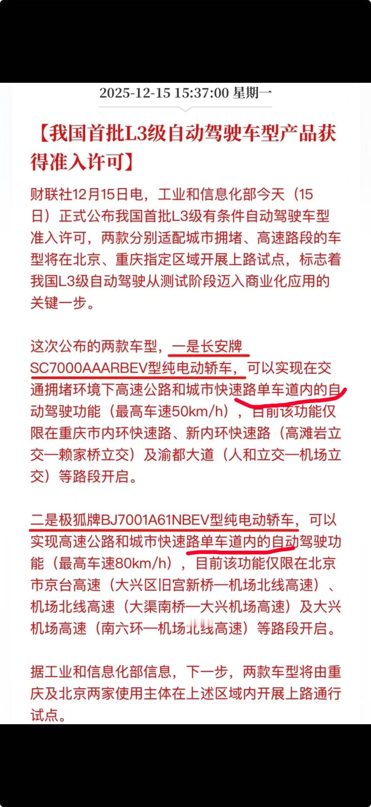 赶在26年来临前,正式发了一波L3准入许可,但路还很漫长,绝不是大家认为的自己手里那些智驾以后就可以放手了目前支持L3的两台车:1.长安深蓝SL03,仅支持重庆部分快速路段,单车道最高50km/h行驶;2.极狐阿尔法S,仅支持北京部分高速路段,单车道最高80km/h行驶。总结一下,按照现在智驾的理解,一辆快速路最高50km/h的LCC,另一辆高速最高80km/h的LCC。你们打算用吗?这么慢,肯定是限制了车道,短时间内L3的体验绝不如L2,所以想达到理想的状态,还要一段时间,现在急着年底发出,可能也是完成某些指标和诺言