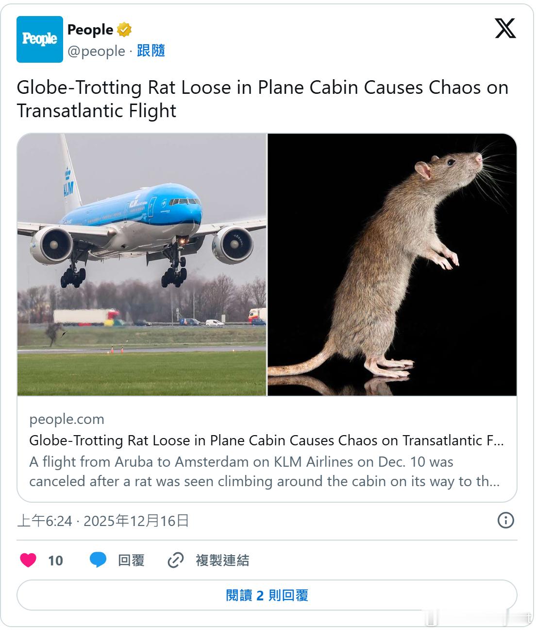 【机长变“巨鼠”?荷兰皇家航空紧急停飞 250名乘客滞留】海外新鲜事 据外媒报道,荷兰皇家航空一架空中客车A330飞机于本月10日从阿姆斯特丹起飞,原定经阿鲁巴飞往荷属海岛波奈。然而,在飞行过程中,机组人员接到多名乘客反映,称飞机上出现了一只“巨鼠”,不仅偷渡登机,还爬上门帘杆,并跳到座位上方的行李置物柜,引发乘客的不安与担忧。荷兰皇家航空公司接到报告后,担心老鼠这种啮齿动物可能会咬坏飞机电线或关键设备,进而威胁飞行安全。飞机抵达阿鲁巴后,航空公司决定对飞机进行彻底清洁,因此临时取消了后续航班,并为受到影响的乘客提供了住宿和替代航班安排。根据航空公司发言人介绍,尽管目前尚不清楚老鼠如何登机,但由于事发时飞机正在飞越大洋,无法立即返航。发言人还表示,机组人员调查后确认,老鼠并未接近机舱内存放食物的区域。图:荷兰皇家航空(KLM)一架空中巴士A330在日前的飞行过程中,被乘客发现有1只体型巨大的老鼠偷渡上机。 (图撷取自社群平台「X」,合成图片)海外编译精选