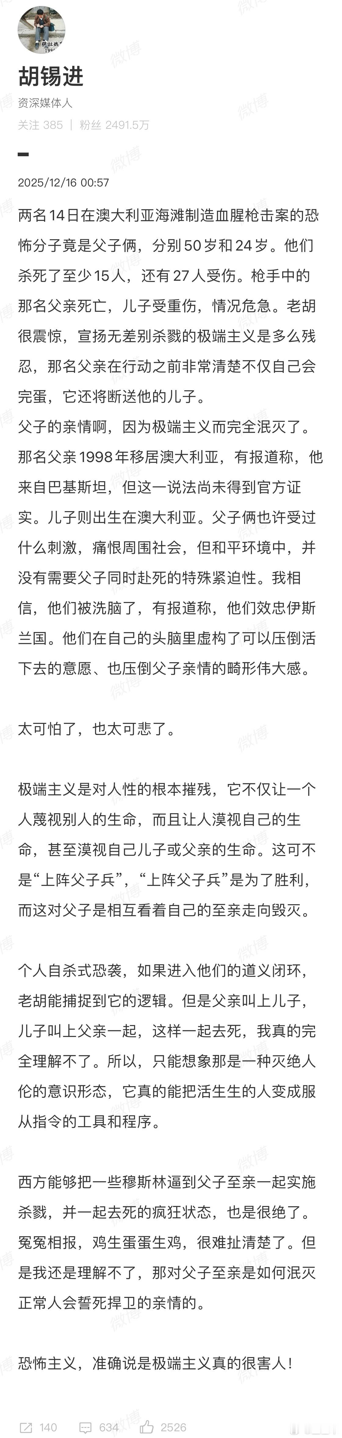 胡锡进又一场无视事实的逻辑裸奔面对澳大利亚发生的父子行凶惨案,他再次祭出了那套万能的“胡氏飞盘逻辑”——怪西方。在他笔下,恐怖主义和极端行为不再是施暴者的罪恶,而是“西方把人逼到了疯狂状态”。他甚至用一种近乎悲悯的笔触,去描绘凶手父子“相互看着至亲走向毁灭”的所谓“道义闭环”。这种论调不仅是在混淆视听,更是在侮辱读者的智商。但把案件的真实细节摆在桌面上,胡锡进那套“被西方逼迫”的叙事,瞬间就会土崩瓦解。胡锡进声称是西方把这群人“逼”到了死角。然而,事实是最好的照妖镜。案件中的父亲并非什么流离失所、饱受歧视的难民,而是早在1998年就以留学生身份从巴基斯坦主动前往澳大利亚的“追梦者”。他通过留学、结婚,一步步合法地在这个西方国家定居、立足。请问胡锡进,这是哪门子的“逼迫”?是一个允许你留学深造的制度在逼迫你吗?是一个接纳你结婚定居的社会在逼迫你吗?如果是“地狱”,他为何在1998年主动投奔?更讽刺的是,行凶的儿子是在澳大利亚出生的。他从出生起就享受着澳大利亚的医疗、教育和社会资源,是一个彻头彻尾的“西方孩子”。他没有背负上一代的战乱记忆,也没有经历过颠沛流离。父子二人,一个主动选择融入,一个生于斯长于斯。他们享受了西方社会的红利,最后却拿起了屠刀。胡锡进对此视而不见,硬要将其包装成“被压迫者的绝地反击”,这不仅是对事实的歪曲,更是对暴行的洗地。如果按照胡锡进的逻辑,“西方环境”是催生极端主义的温床,那么那些真正经历过战火、从叙利亚等战乱国家逃到西方的难民,岂不应该是个个苦大仇深?现实却又给了胡锡进一记响亮的耳光。在这次恐怖袭击中,挺身而出、被称为“夺枪英雄”的关键人物,恰恰是一名2006年从叙利亚移民到澳大利亚的男子。他来自真正的战乱之地,他比任何人都更有理由抱怨命运的不公,但他选择了什么?他选择了守护生命,选择了勇敢地对抗暴徒。凶手: 享受了西方20多年的安稳生活,却变成了恶魔。英雄: 逃离了战火纷飞的中东,却在西方成为了守护者。这一鲜明的对比直接击穿了胡锡进的谬论。一个人是否选择极端,取决于他的人性、观念和所受的极端思想毒害,而不是所谓的“西方逼迫”。那个叙利亚移民用行动证明了,文明与野蛮的选择,在于人心,而不在于地缘。胡锡进在文中感叹“很难扯清楚”冤冤相报的逻辑,试图把极端主义的根源搅成一锅粥。这种乡愿式的“和稀泥”,实则才是极其危险的。当他把恐怖分子的残暴归结为“外部环境的逼迫”时,他实际上是在剥夺个体的道德责任。按照这个逻辑,任何在社会中感到不如意的人,只要去杀人放火,都可以说是“社会把他逼疯了”。这难道不是在为潜在的恐怖分子寻找心理借口吗?澳大利亚面对此类事件,正在讨论的是进一步控枪,是通过法律和制度来堵塞漏洞,保护公民安全。这才是正常的、反省的逻辑。相比之下,美国在枪击案频发后缺乏反省能力,才是反面教材。澳大利亚政府试图通过控枪来解决问题,正是“正道”所在。胡锡进此番的言论,典型地体现了他表面上“为了反西方而反西方”的思维定势。为了攻击西方,他不惜无视基本事实,强行将享受了移民红利的凶手描绘成受害者,甚至不惜让真正的反恐英雄“隐身”。极端主义确实是人类的毒瘤,但切除毒瘤靠的是正义的利剑和制度的完善,而不是胡锡进这种“都是别人逼的”廉价借口。凶手就是凶手,无论他们的父子情深看起来多么“悲壮”,都掩盖不了滥杀无辜的罪恶。澳总理称夺枪男子是澳大利亚的英雄悉尼邦迪滩枪击事件悉尼夺枪男子已收到100万美元捐款