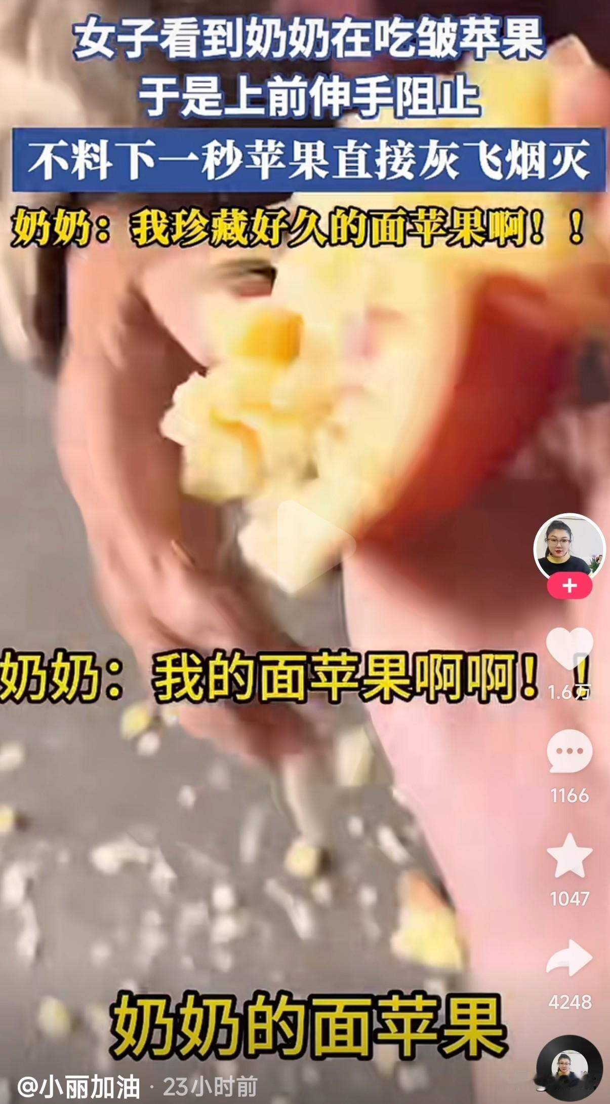 女子看到奶奶在吃皱苹果,于是上前伸手去阻止,不料下一秒苹果直接灰飞烟灭,奶奶当即说道我珍藏好久的面苹果啊! 这孙女也是好心办了坏事,她以为奶奶吃的皱苹果已经坏了,于是上前立即阻止奶奶不要吃了,奶奶急忙护着不给孙女,孙女又使劲从奶奶手里去抢,连解释的机会都不给奶奶,苹果当即也灰飞烟灭了,苹果洒落一地后奶奶却说这是她珍藏了好久的面苹果。 对于老了牙口不好的人来说,吃点软和能咬动的东西就很知足了,谁能想到自己珍藏了好久的面苹果居然被孙女认为是坏苹果,瞬间给弄碎浪费了,这孙女也是好心办了坏事,可惜了奶奶给自己珍藏已久的面苹果了,不知过后孙女得知实情会不会自责内疚呢?