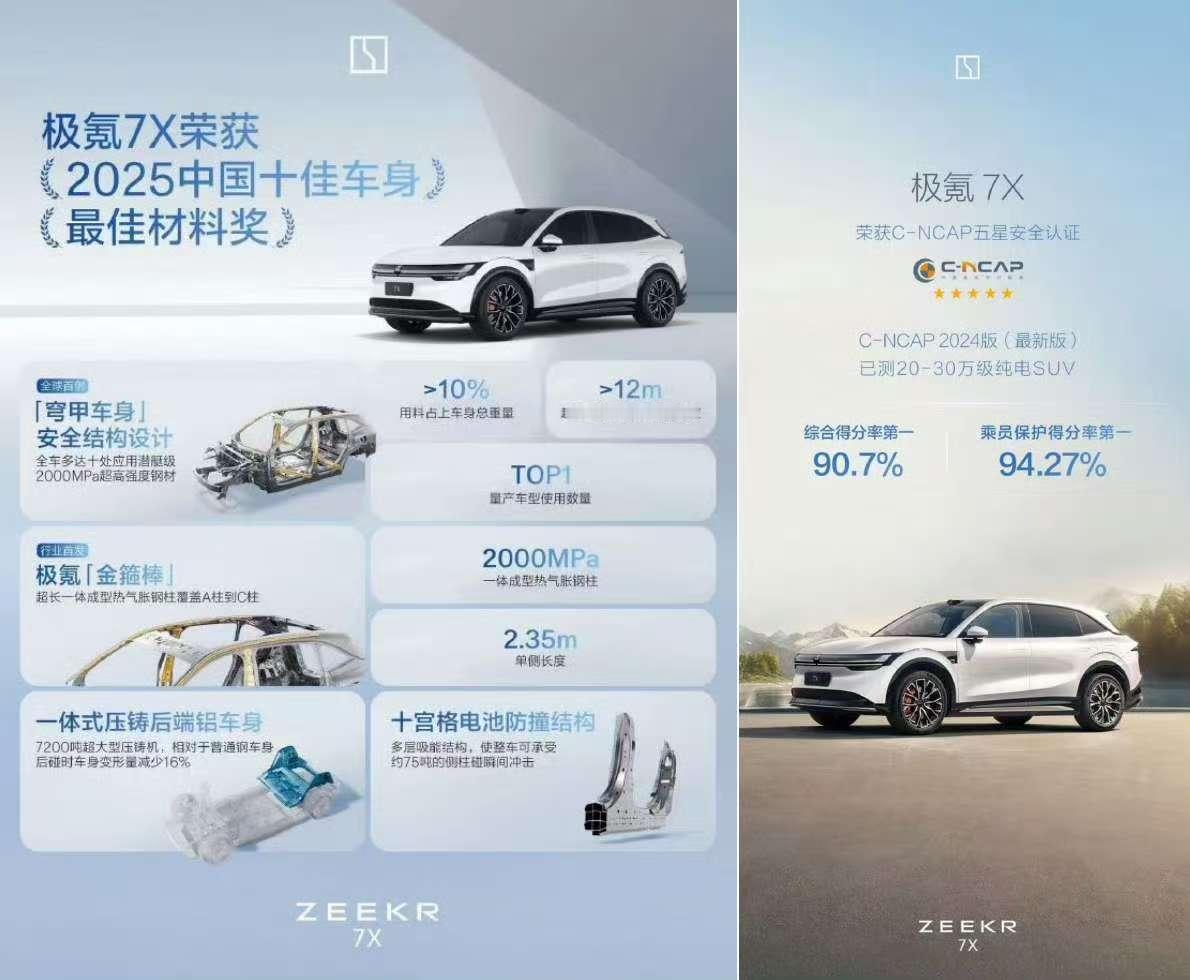 看到央视点赞极氪金箍棒,这才更深刻感知到极氪7X的安全配置也太实在了,拿的奖项更是实打实的硬气!还拿下了《2025中国十佳车身》和《最佳材料奖》,C-NCAP五星认证还拿了综合得分率、乘员保护得分率双第一,这奖拿得是真没水分。而且它的安全可不是只靠奖项撑场面,主动安全上有130km/h能刹停的AEB、能绕障的AES,还有全系标配的激光雷达和Thor-U芯片,预判风险的能力拉满;被动安全更狠,2000MPa的潜艇级钢材、八横九纵防撞结构,还有7个气囊、带气囊的儿童安全座椅,甚至行业首发的一键破窗,从大人到小孩的安全都考虑到了。这么看极氪7X叫 安全标准制定者是真没吹牛,给家人选车的话,这安全感直接拉满了!焕新极氪7X