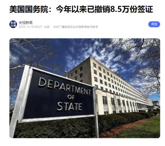 美国国务院宣布了 12月10日,美国国务院宣布:自1月以来已撤销8.5万份签证,