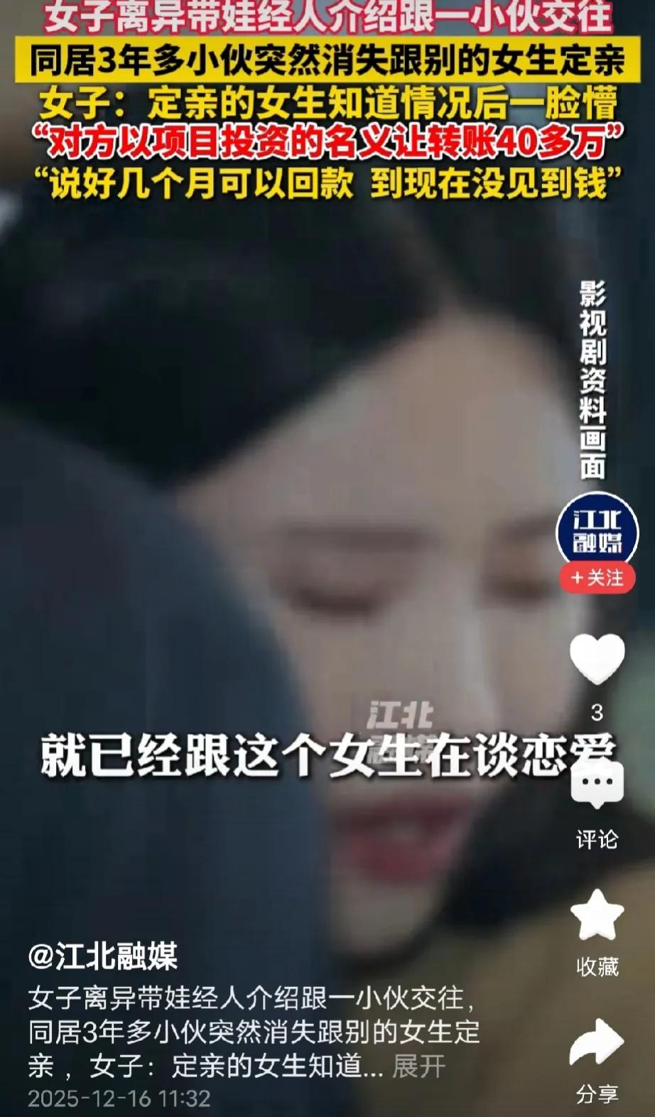江苏连云港,离异带娃的女子爱上一小伙,两人恋爱4年,同居3年,小伙说投资修国道有15%到20%的利润,而且回本很快,女子和家人信以为真,借钱给他投了47万,谁料,投钱不久,小伙就以工地忙鲜少回家,9个月后,小伙拉黑了女子,女子着急不已,没想到,再次联系上发现,他已和别的女孩定亲了。女子伤心不已:4年的等待人财两空,我对不起家人,也对不起自己。 张女士曾经有过一段婚姻,后来因为各种原因她跟前夫分开了,张女士跟前夫离婚后带着孩子回到娘家生活。 2021年,经人介绍,张女士认识了李先生(化姓),李先生是一个年轻的小伙子,从没结过婚。 介绍人跟李先生说了张女士的情况后,李先生说他不介意张女士离异带娃,还说这个年代这种现象很正常,只要两个人合得来,一切都不是问题。 张女士见李先生不介意自己的过去,而且表现得很有诚意,给她的印象加了不少分,两人就这样试着相处。 随着相处的时间越来越久,张女士渐渐对李先生产生感情,李先生也很懂得体贴和照顾张女士,两人很快就确定了恋爱关系。 2022年,认识了将近一年的张女士和李先生搬到一起,正式开始同居生活。 虽然他们没有领证结婚,但是两人就像真正的夫妻一样相处着,张女士的家人也很信任和喜欢李先生。 李先生是干工地的,哪里有工他就往哪里跑,每次李先生要到外地做工,张女士跟孩子就在家等着他回来。 去年年底,李先生突然对张女士说,有个挺好挺赚钱的项目,可以投资一下,回本很快。 张女士对李先生的话百分之百的信任,她问李先生是什么项目? 李先生说是修国道的项目,投资下去大概有15%到20%的利润,很快就能回本。 张女士把这个事情告诉了自己的家人,他们也很信任李先生,都想跟着一起赚钱,于是一家子东拼西凑,凑了47万元交给李先生,就等着他带张家人发财了。 今年开始,李先生就以工地忙为由很少回家,张女士也没有怀疑,男人干事业,她作为一个女人也不懂,也帮不上什么忙,只能无条件信任。 有时,张女士偶尔也会问修国道项目的事情,问他什么时候可以回本,但,李先生总能巧妙地把谎圆过去。 张女士也没有多想,她安慰自己,大工程回本应该都比较慢。 没想到,前段时间有一天,李先生突然给张女士发来很长很长的信息,说着两人感情的问题,之后就把张女士拉黑了。 当时,张女士在外面,看到那个信息,她立马着急忙慌赶回家,回到家发现李先生的东西全部搬走了,她的微信也被拉黑了。 后来张女士用别人的手机给李先生打电话,李先生说,有什么问题你直接上法院起诉我也行。 张女士不知道自己错在哪,也不知道他们之间出现了什么问题,她就这样莫名其妙被分手了。 如今,张女士已经被拉黑20多天,前天她无意中从朋友那得知,张先生已经和别的女孩定亲了。 张女士伤心不已,她找到那个女孩,把她和李先生的情况告诉女孩,那个女孩听完也是一脸懵。 后来经过了解,张女士得知,李先生在今年3月份就已经跟那个女孩谈恋爱了。 张女士心痛不已,在一起4年,同居3年,投入了很多感情,给他投资的47万也一分没收回。 张女士说,如今的她人财两空,她对不起家人,也对不起自己。 有人说,看了这个事件可真够讽刺的!一个离异带娃的女人掏心掏肺四年,同居三年,把对方当成可以托付余生的人,结果碰上的是个彻头彻尾的感情骗子加敛财高手。 嘴上说着不介意她的过去,转头就一边哄着她投钱搞所谓的“国道投资”,一边偷偷和别的女人谈婚论嫁,算盘打得比谁都精。 47万是人家全家东拼西凑的血汗钱,他轻飘飘一句“去法院起诉”就想甩锅,拉黑消失的样子简直卑劣。 张女士的真心喂了狗,信任成了别人拿捏她的把柄,最后落得人财两空,还要背负对家人的愧疚。 这哪里是谈恋爱,分明是一场精心设计的骗局,心软和轻信,终究被别有用心的人狠狠利用,这教训实在太痛! 李先生的行为违反了《刑法》第266条的规定,诈骗公私财物,数额较大的,处三年以下有期徒刑、拘役或者管制,并处或者单处罚金。 数额巨大或者有其他严重情节的,处三年以上十年以下有期徒刑,并处罚金。 数额特别巨大或者有其他特别严重情节的,处十年以上有期徒刑或者无期徒刑,并处罚金或者没收财产。 本案中,李先生以非法占有为目的,虚构修国道高利润投资项目,利用与张女士的恋爱同居关系获取信任,骗取47万元(属“数额巨大”),后拉黑失联并与他人定亲,其行为完全符合诈骗罪构成要件,应依法承担相应刑事责任,张女士可收集转账记录、沟通记录等证据报案维权。 在此,也想劝诫,恋爱中务必保持理性,切勿轻信对方虚构的高回报投资承诺,涉及大额资金往来需核实项目真实性并留存凭证。 对亲密关系中的财务往来保持警惕,避免因情感信任陷入骗局,遭遇欺诈及时报警维权。 关注@猫眼学法 品读案例故事,学习法律经验
