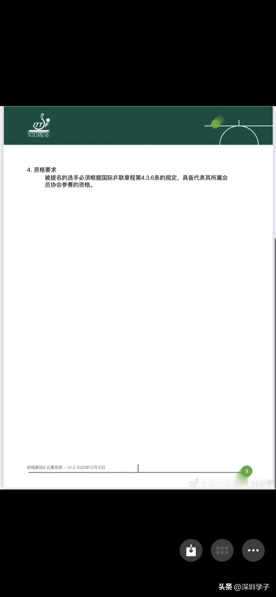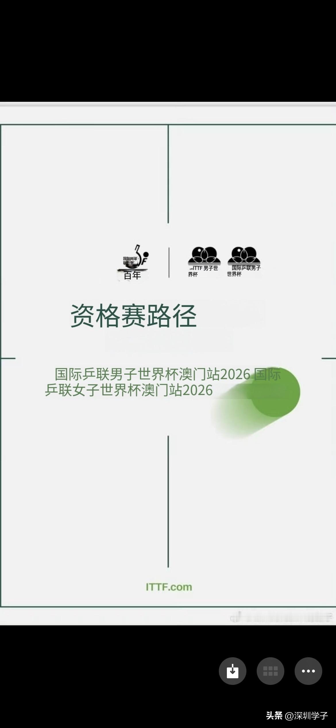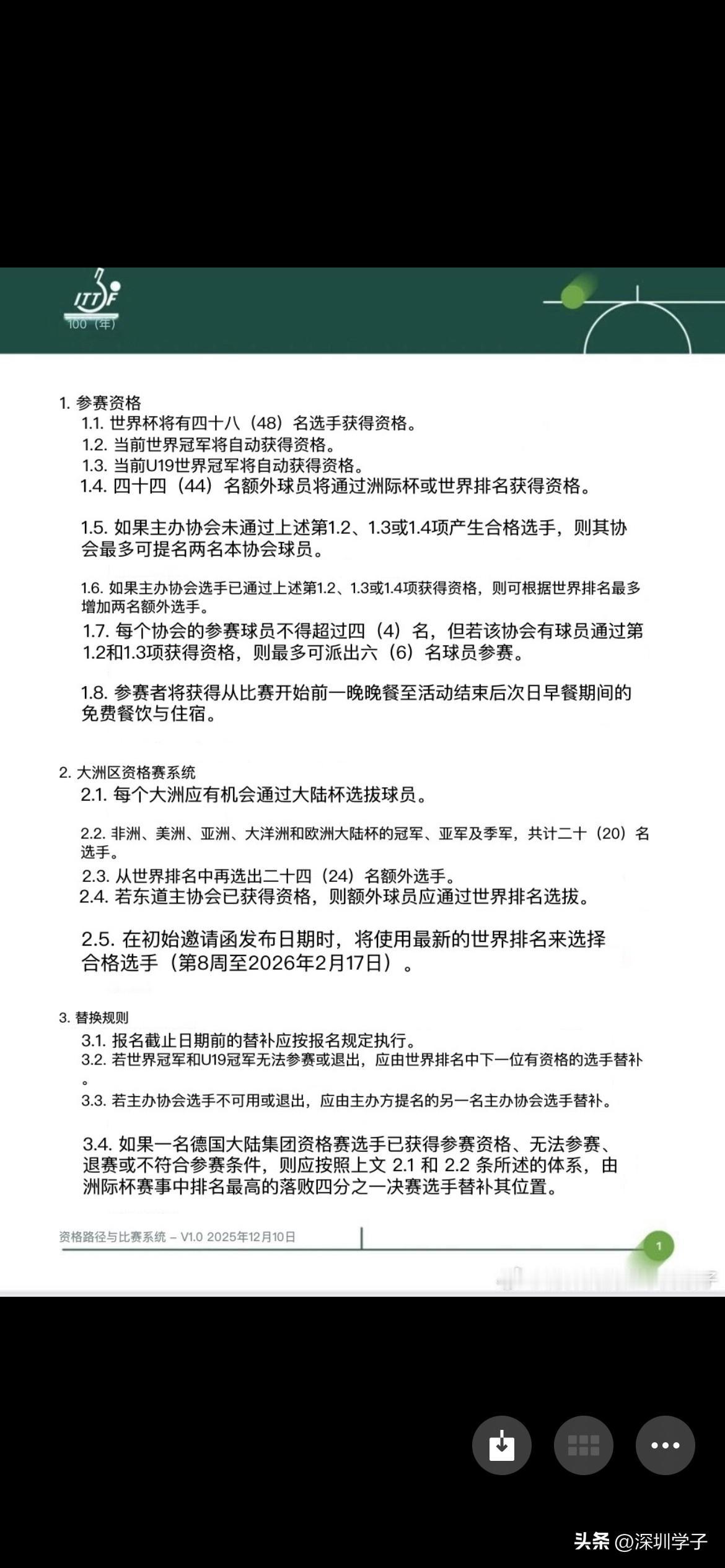 今天ITTF发布2026年国际乒联澳门世界杯的资格获取途径(如下三图)。 按照以下途径,樊振东有资格参赛吗? 樊振东算是现 国内第一高手、全运会男子单打冠军,他不打wtt就不能参赛吗? 我觉得这个有待商榷吧?一定会有好的方式方法解决的,中国乒协应该会有谈判话语权的,就看怎么博弈了。 在我看来,如果国乒想让樊振东参赛,那自有办法,如果国乒不想让樊振东参赛就会直接沿用世界排名,这样他自然就排除在外了。 就看上层意愿吧。看亚洲杯会不会给机会东哥去打。去打个亚洲杯东哥拿个冠军,就解决问题了。 期待东哥的国际赛场。