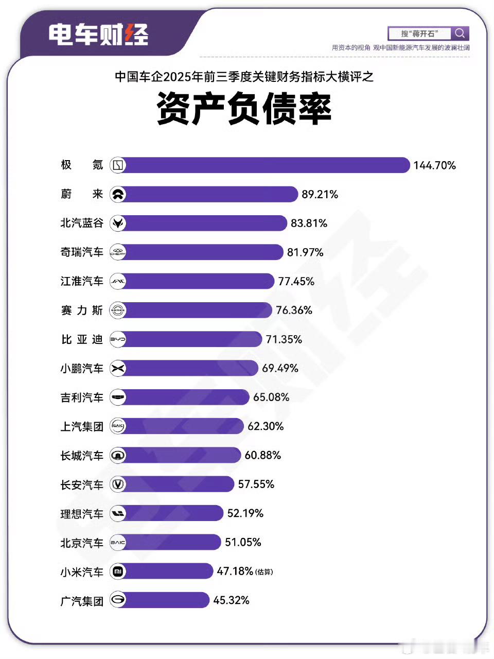 汽车民生 负债率最高的车企是他:144.7%!为什么车企的负债率都那么高?1、极 氪 144.70%2、蔚来 89.21%3、北汽蓝谷 83.81%4、奇瑞汽车 81.97%5、江淮汽车 77.45%6、赛力斯 76.36%7、比亚迪 71.35%8、小鹏汽车 69.49%9、吉利汽车 65.08%10、上汽集团 62.30%11、长城汽车 60.88%12、长安汽车 57.55%13、理想汽车 52.19%14、北京汽车 51.05%15、小米汽车 47.18%(估算)16、广汽集团 45.32%