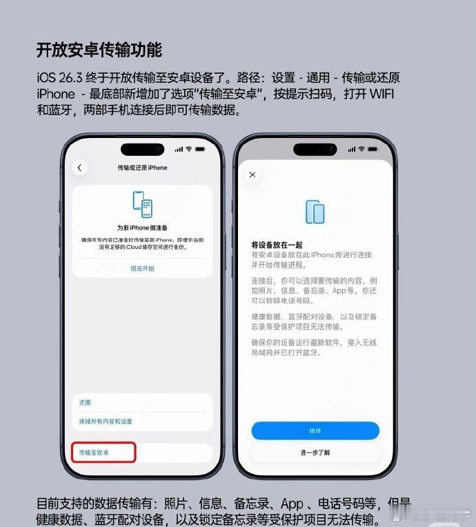 苹果安卓实现互通 终于等到了!苹果和安卓两大系统首次实现原生级互通功能,尤其是iOS 26.3测试版新增的“传输至安卓”选项,让用户无需第三方工具即可无线迁移数据。不过游戏账号仍不互通,大家可以稍等等~苹果官方支持安卓传输:iOS 26.3测试版新增 “传输至安卓”功能。设置路径可参考:设置 > 通用 > 传输或还原iPhone),目前支持将照片、短信、备忘录、App、密码等数据直接迁移至安卓设备。操作时需将两台设备靠近,通过蓝牙和Wi-Fi直连传输。限制:健康数据、加密内容(如锁定备忘录)及蓝牙设备配对暂不支持。该功能预计2026年1月下旬正式推送;游戏还不支持。来聊聊,你喜欢用苹果还是安卓?最想要互通的功能是啥?