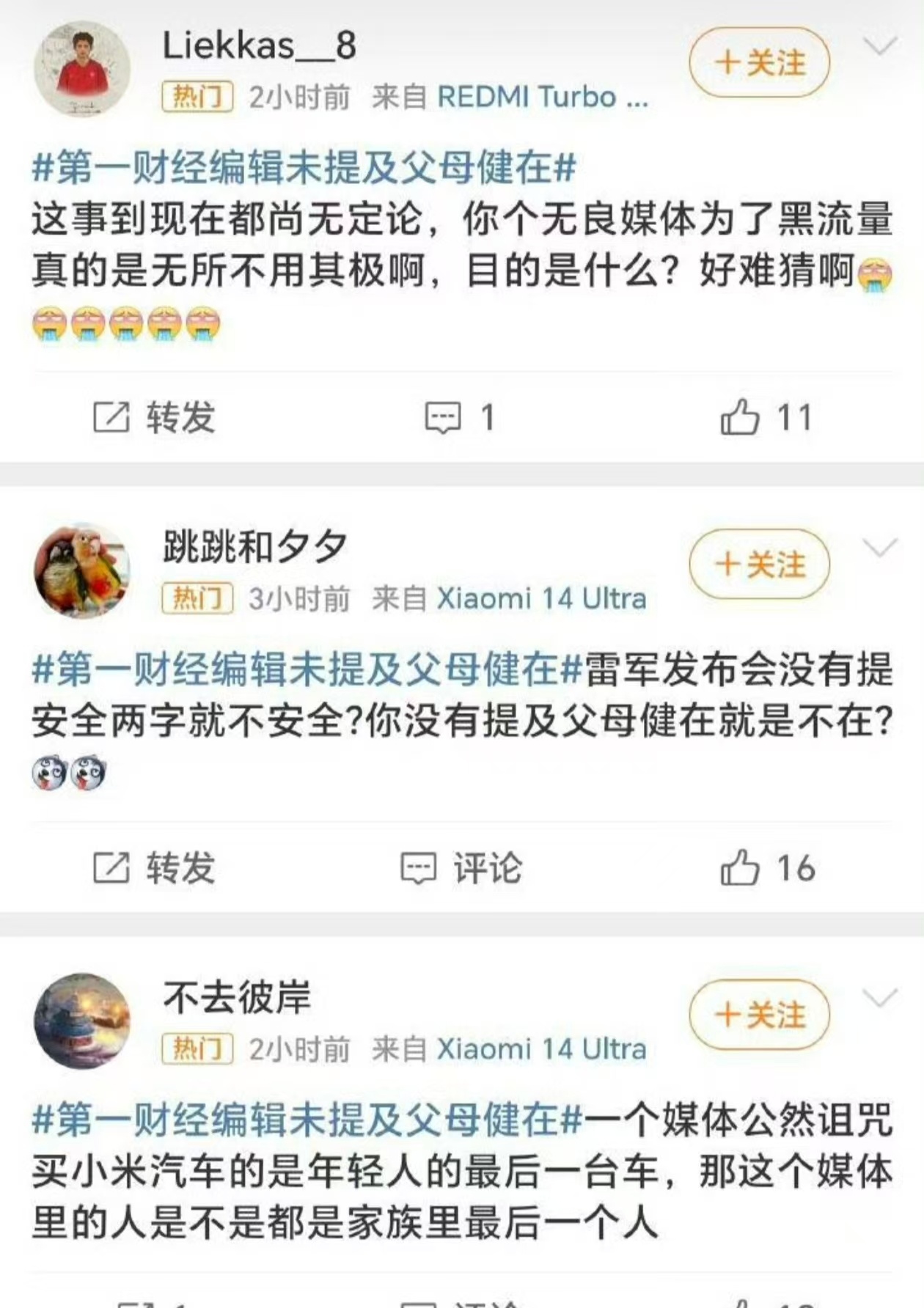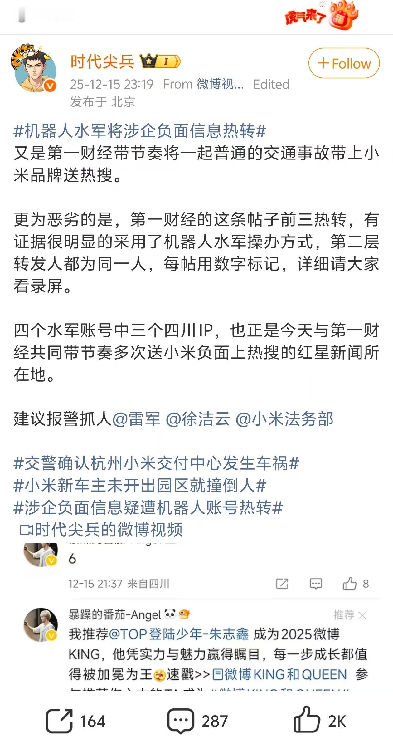 机器人水军将涉企负面信息热转看看这个事真的要被气笑了,第一财经把一起普通车祸硬是和小米绑在一起送上了热搜。更离谱的是,他们那条帖子底下,热转前三明显是机器人水军在干活。证据摆在那儿,第二层转发全是同一个人,每条还标着数字,一个号能把同一内容转几十遍。这手法可真够卑劣的,表面上看是赚流量,实际上玩的是长期套路。通过不停发小米的负面,吓得其他公司主动找上门谈合作,说白了就是变相收保护费。媒体竞争见过不少,但用机器人这么明目张胆带节奏,真的已经越过底线了!