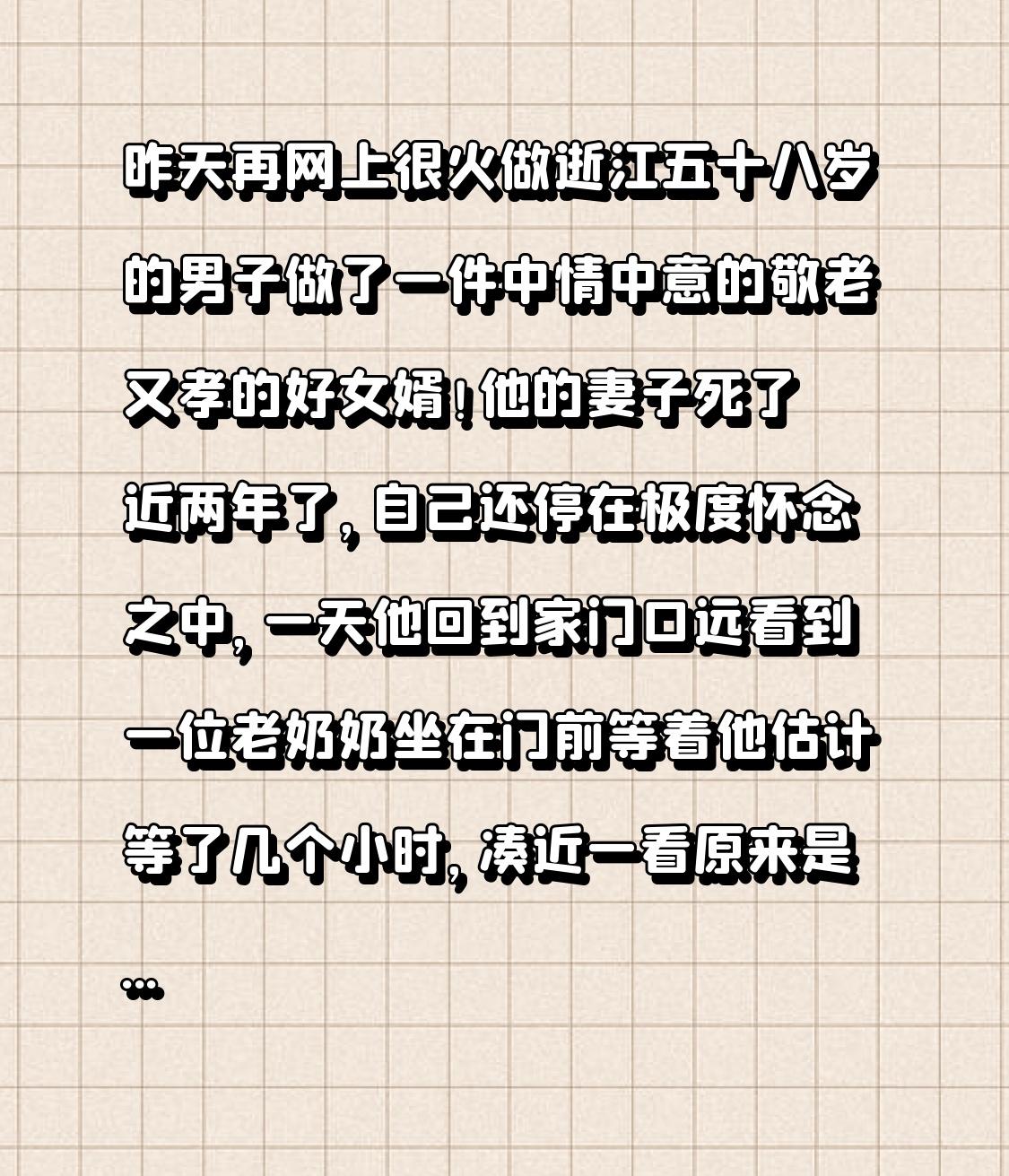 昨天在网上很火的一件事,浙江一位五十八岁的男子,堪称敬老又尽孝的好女婿!他的妻子去世近两年了,他仍深陷极度怀念之中。 一天,他回到家门口,远远看见一位老奶奶坐在门前等他,估计等了好几个小时。凑近一看,原来是老岳母。他赶忙走上前,将老奶奶搀扶起来,轻声又亲切地说道:“妈,您有事打个电话给我就行,我去也方便些。” 回家坐下,他给岳母倒了杯水。之后,女婿说:“妈,咱们去外面吃吧!”岳母说:“不用,家里随便烧点蔬菜饭就行。”女婿很快做了几个岳母爱吃的菜。 吃完饭,女婿轻声问岳母:“妈,您有啥事就直说吧!”岳母叹口气说:“老头子最近好像不太好,脸色差,没力气,走路都吃力,我本想带他去看看,可我们老两口勉强种点菜自己吃,农活都干不了,也没钱。能不能借点钱,我带他去医院看看啥病。” 女婿说:“妈,您坐会儿,我一会儿就回来。”他出去到银行取了六万现金交给岳母,还对岳母说:“您放心,这六万元钱给您和爸以后生活用。我在附近院子租了一室一厅,有卫生间和伙房,还是一楼,还有个小院子。以后我给您二老养老。虽说您女儿已病故,白发人送黑发人,您心里难过,但现在我就回去把爸接过来看病,看好了就在我附近养老,我好照看。一个女婿半个儿,您女儿已不在了,女婿就是您的儿子!” 这位女婿重情重义,其善心孝心感天动地。大家说说,他是不是好人?