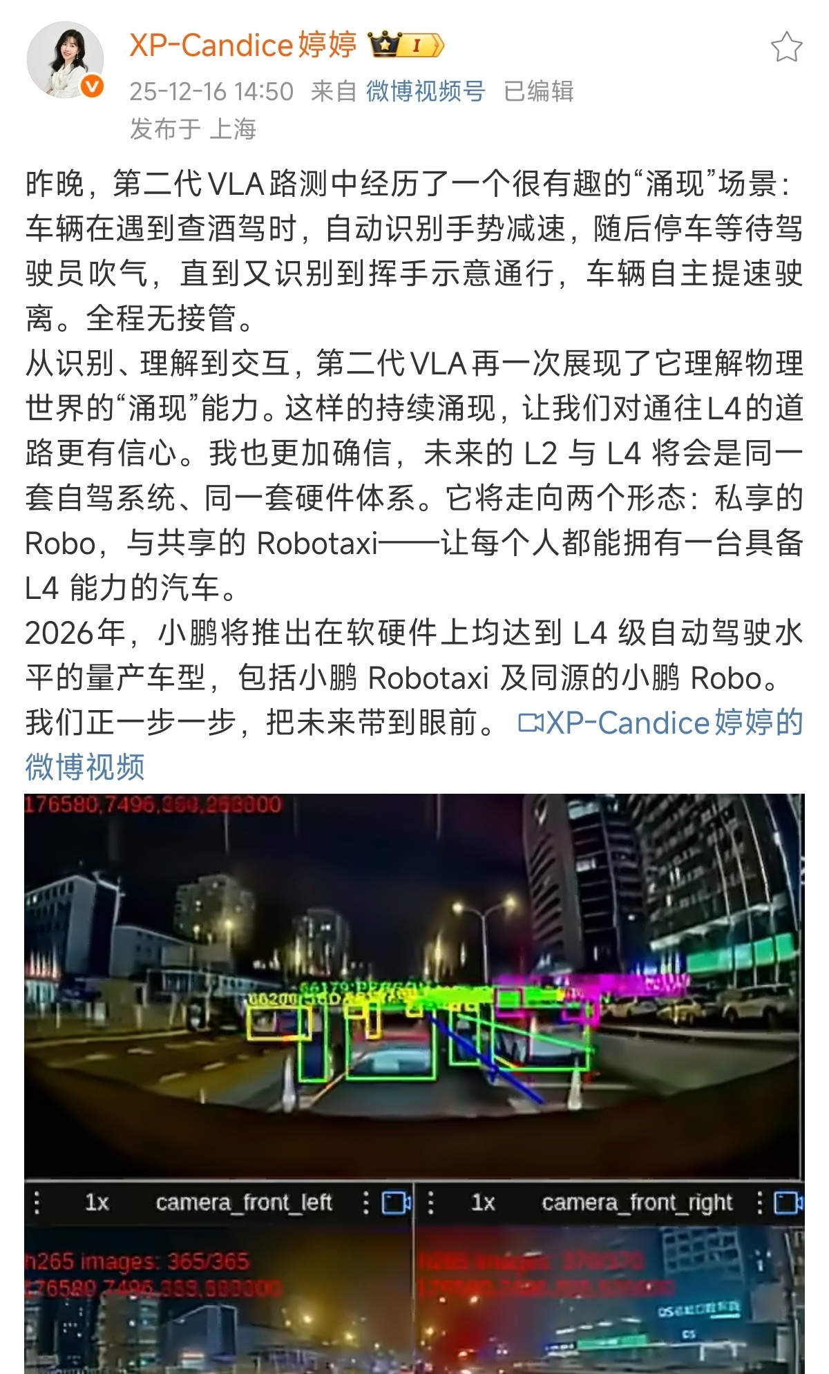 拿到广州L3级自动驾驶高快速路测试牌照,小鹏的智驾落地又多了一块关键拼图。这不是突发的突破,而是技术积累到一定阶段的必然结果。毕竟当行业还在讨论L3的落地细节时,小鹏的目光早已投向L4。小鹏获L3级自动驾驶道路测试牌照昨晚第二代VLA的路测场景很有说服力:查酒驾时自动识别手势减速、停车等待,收到通行示意后自主驶离,全程无接管的流畅度,恰恰印证了VLA“视觉-语言-动作”端到端架构的优势。没有花哨的宣传,只靠实际场景中的“涌现”能力说话,这种从毛细血管场景积累的智能,比单纯的参数堆砌更有价值。小鹏第二代VLA涌现自动识别手势场景小鹏在2026年一季度量产上车的规划清晰,软硬件均达L4级的车型也已提上日程。从L3测试到L4落地,小鹏走的是稳扎稳打的路线,这种对技术规律的尊重,或许正是智能驾驶最该有的样子。
