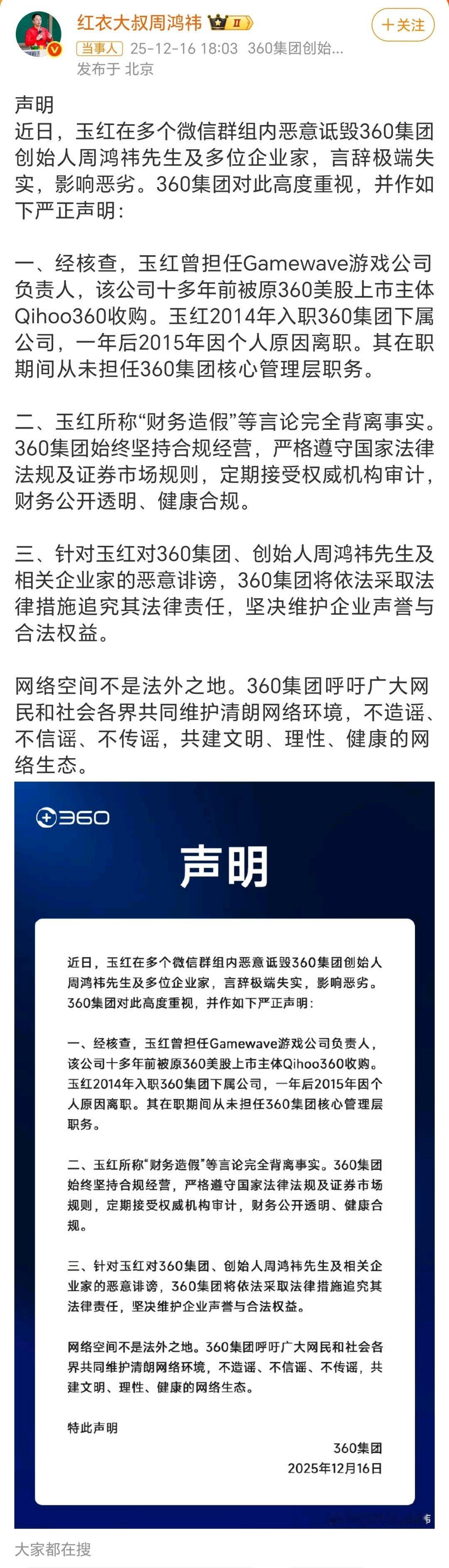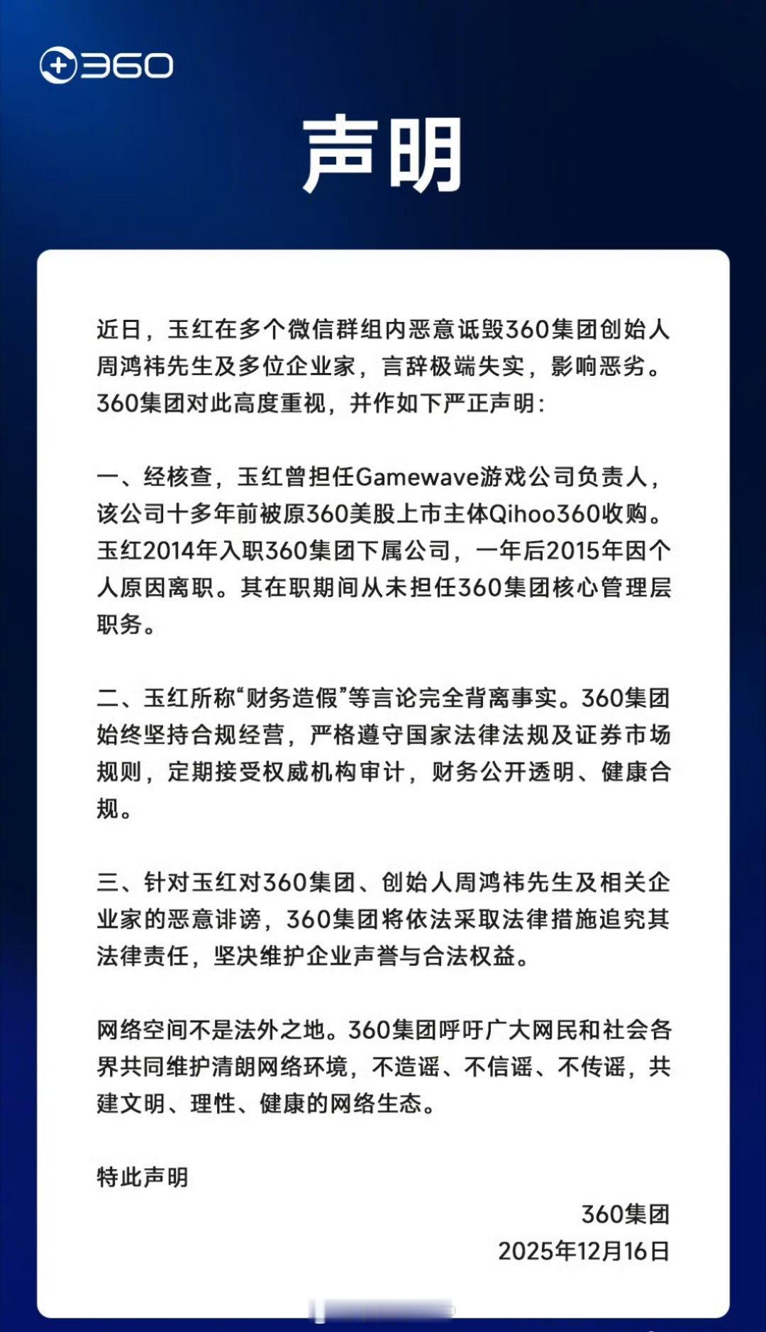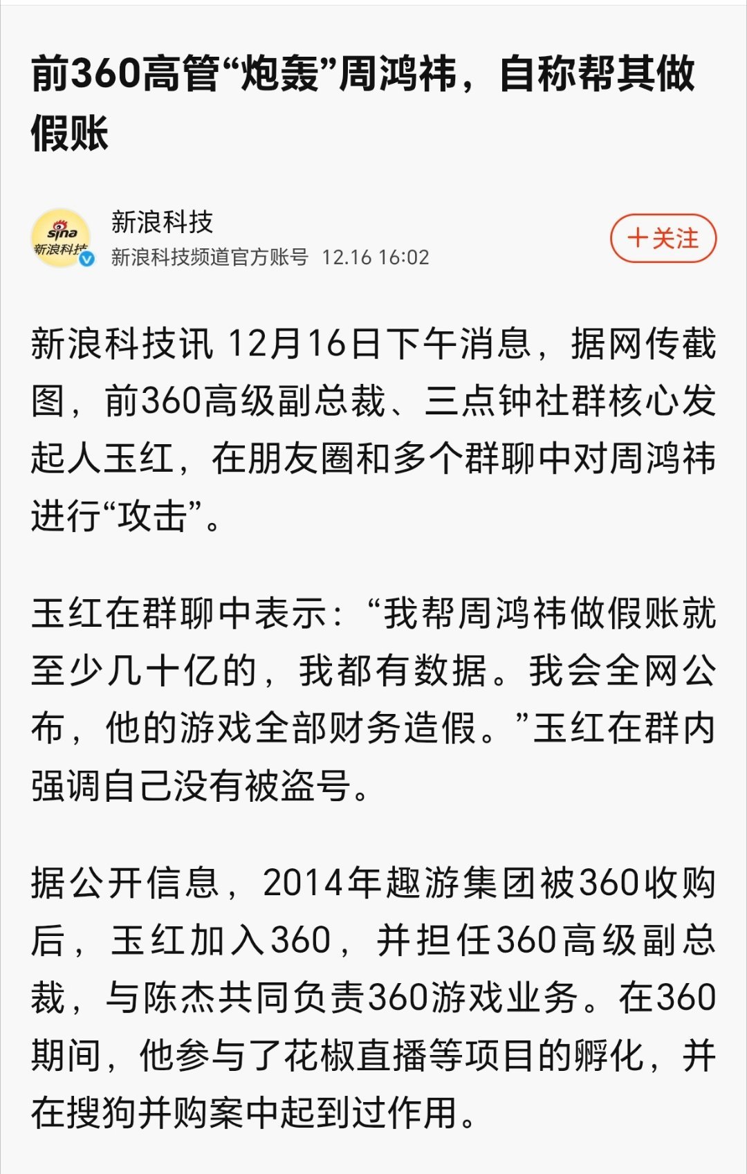 前360高管炮轰周鸿祎周鸿祎辟谣360财务造假前360高管“炮轰”周鸿祎、自称帮其做假账周鸿祎发表声明:近日,玉红在多个微信群组内恶意诋毁360集团创始人周鸿祎先生及多位企业家,言辞极端失实,影响恶劣。360集团对此高度重视,并作如下严正声明: