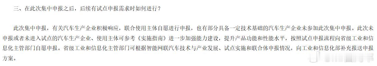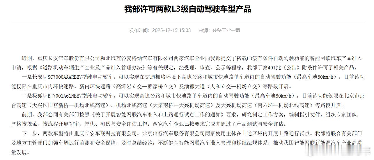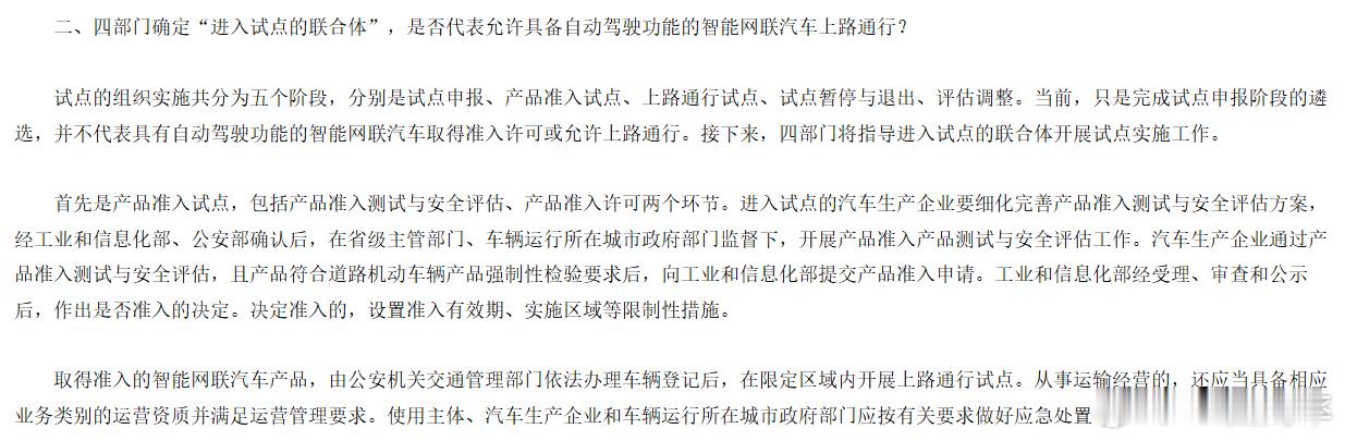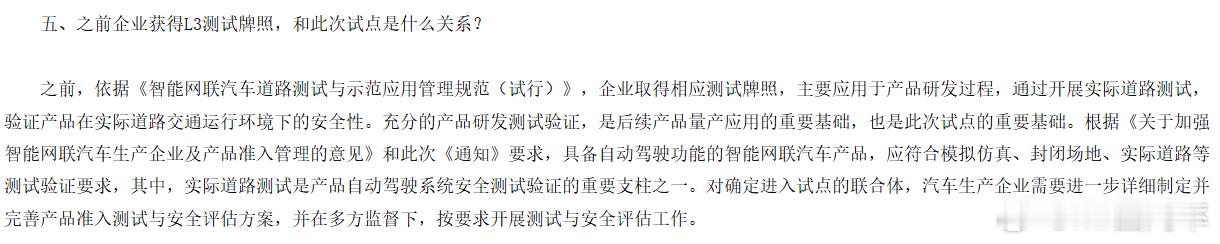 两款l3级自动驾驶车型产品获许可 某些自媒体又开始上纲上线论高低,这东西还是之前《关于开展智能网联汽车准入和上路通行试点工作的通知》的延伸标准动作。其实在工信部“智能网联汽车准入和上路通行试点工作问答”中有详细说明这个试点工作的含义。几个核心内容给大家再说明下:1、试点包括集中申报和后续常态化补充申报,不是说这批不申报就没机会了,后续只需要向省工信厅申报后再上报到国家工信部审核就可以了。2、试点的组织实施共分为五个阶段,分别是试点申报、产品准入试点、上路通行试点、试点暂停与退出、评估调整。这次的两款车是到第三个阶段,离L3推送上路还远着呢。3、之前企业获得L3测试牌照和这次试点的工作关系,之前的L3牌照主要应用于产品研发过程,这次的试点通过开展实际道路测试,验证产品在实际道路交通运行环境下的安全性,实际道路测试是产品自动驾驶系统安全测试验证的重要支柱之一。大v聊车