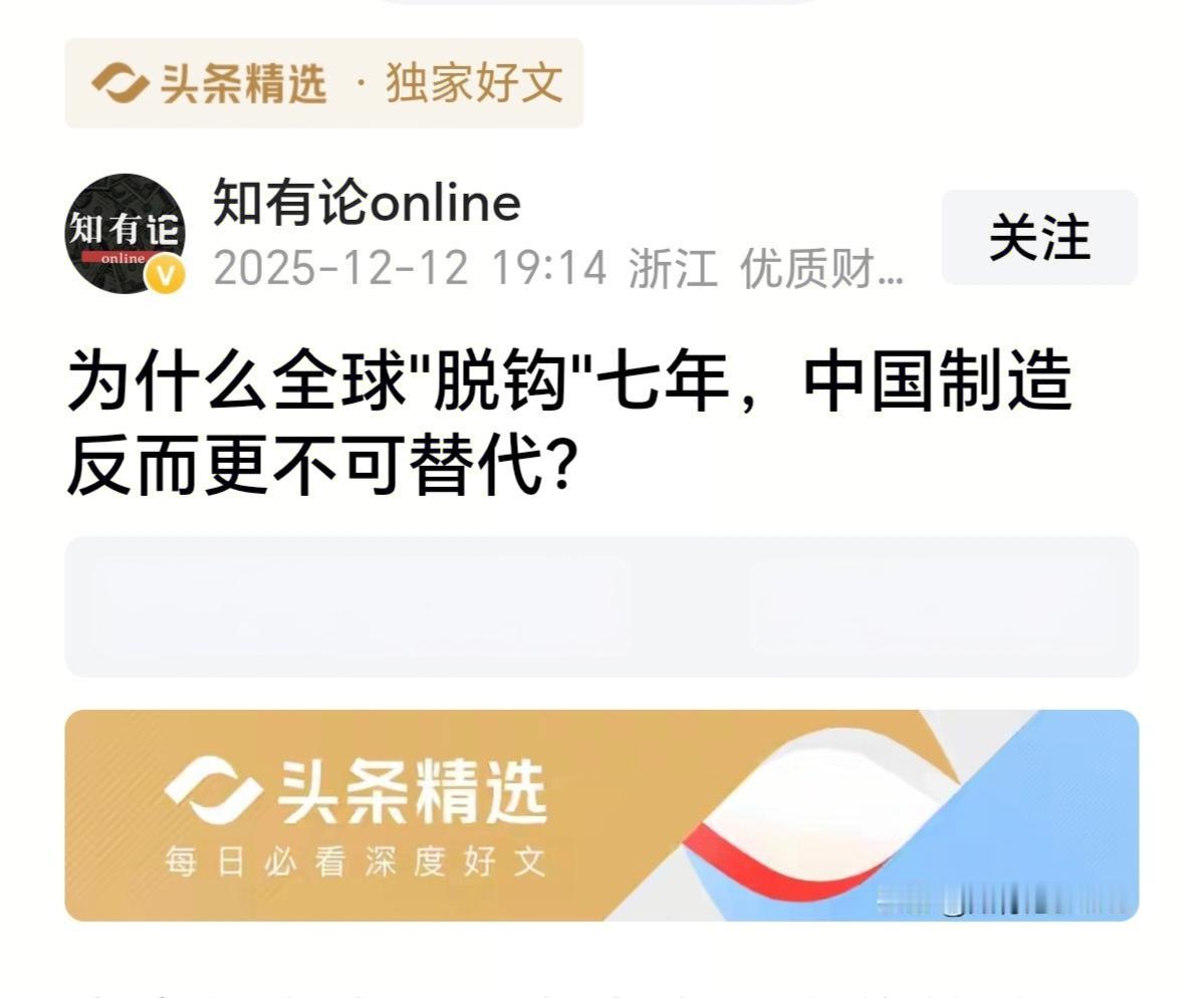《为什么全球"脱钩"七年,中国制造反而更不可替代?》,知有论online这篇文章跳出“成本优势”的老旧叙事,以“产业生态不可分割性”为核心,撕开了“越南制造”“墨西哥制造”的外衣——所谓替代不过是“中国供应链+海外组装”的伪装。从智能工厂的技术跃迁,到产业集群的协同效率,文章精准戳破“脱钩”谎言:中国制造早已从“世界工厂”升级为“全球制造业心脏”。那些试图剥离中国的产业链,不过是拉长了血管,却离不开核心供血系统。这一视角,为理解全球产业格局提供了极具价值的思考。