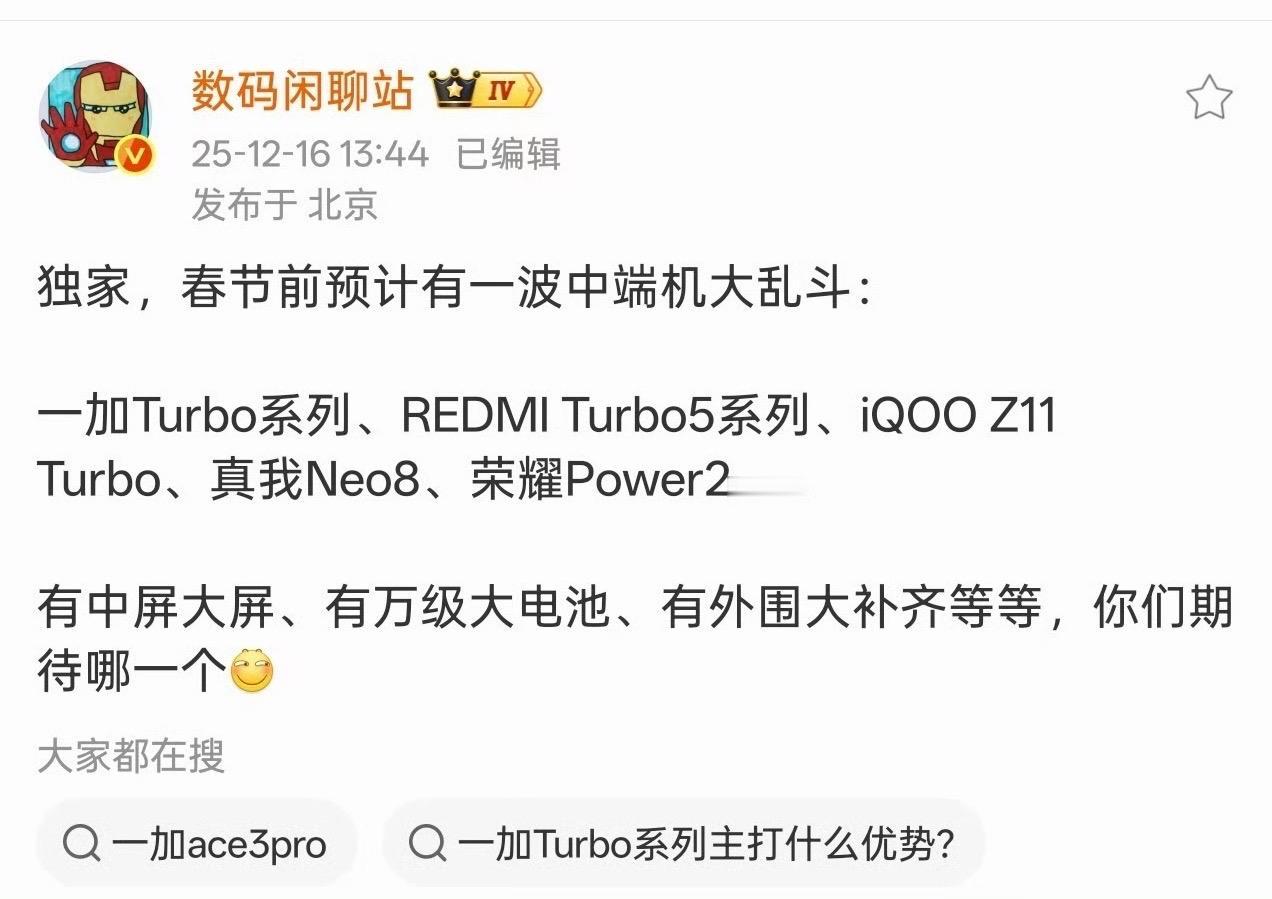 春节之前依旧有一批新机要发布,大部分都是中端机,准备换机的可以蹲一波。 1、华为Nova15系列:定档12月22日发布,有华为Nova15、华为Nova15 Pro和华为Nova15 Ultra三种机型; 2、一加Tubro:定位中端性能赛道,主打游戏和长续航; 3、REDMI Tubro5系列:6.6英寸1.5K直屏、金属中框+大R角、首发天玑8500/天玑9500e、7000mAh/9000mAh; 4、iQOO Z11 Tubro:6.78英寸直屏、144Hz刷新率、骁龙8 Gen 5、9000mAh+90W、2亿像素主摄、金属中框+玻璃后盖; 5、真我Neo8:6.78英寸直屏、165Hz刷新率、超8000mAh+100W; 6、荣耀WIN:在16日的“生而为赢”沟通会上揭晓了该品牌,亮点在10000mAh电池和主动散热风扇; 7、荣耀Power 2:6.79英寸直屏、3840Hz高频PWM调光、联发科天玑8500、超10000mAh+80W、双向北斗卫星消息、后置50MP+8MP; 8、小米17 Ultra应该是本月发布,目前没放出什么消息。