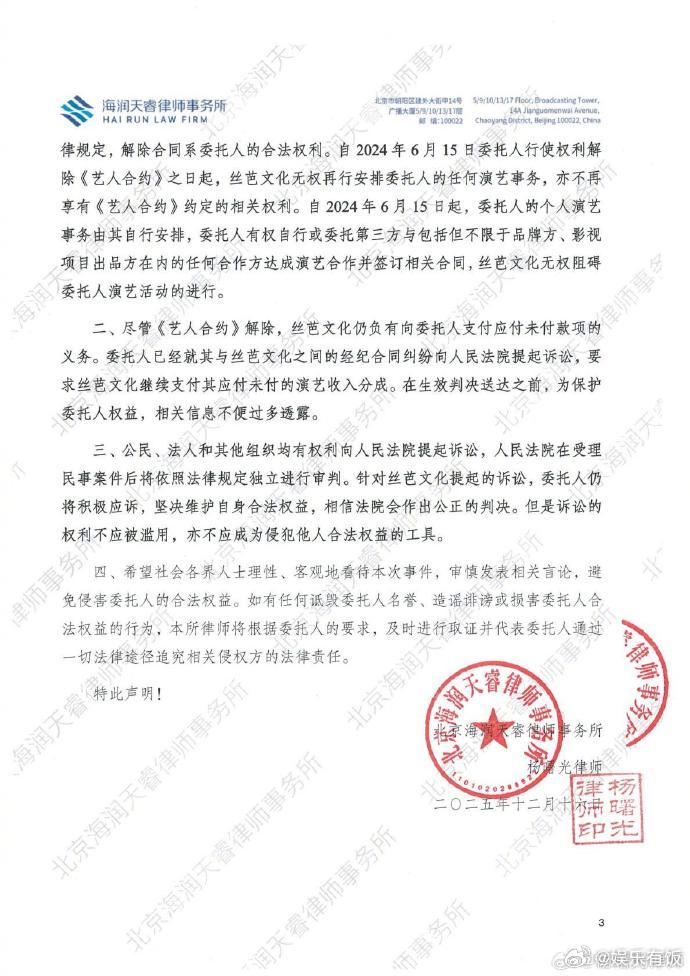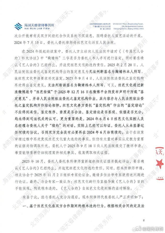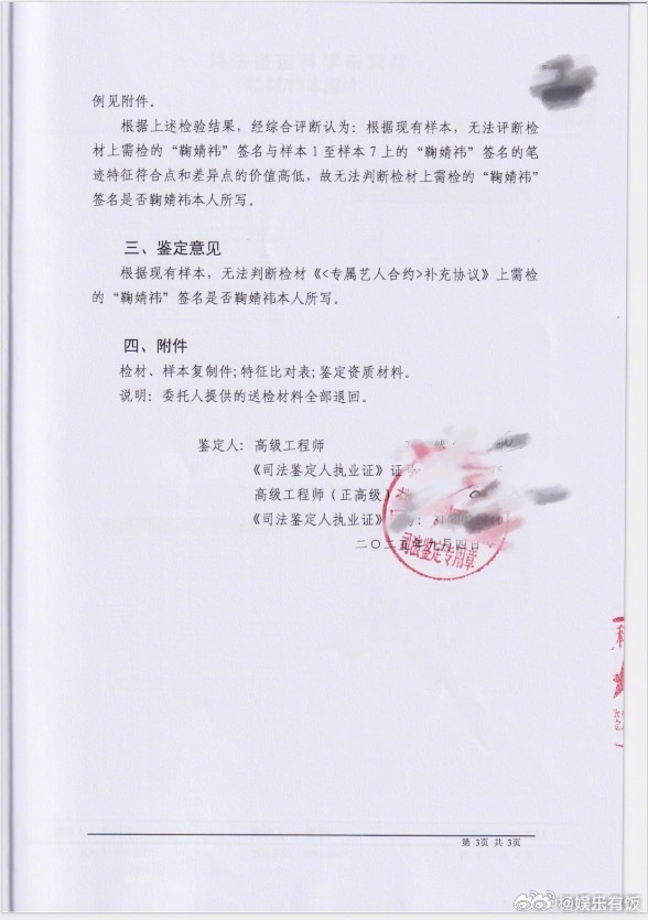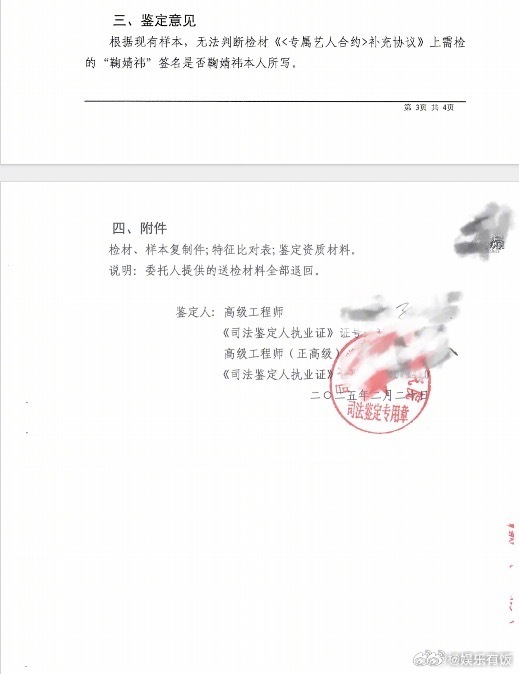 鞠婧祎方称丝芭笔迹鉴定结果不可信 16 日,鞠婧祎方通过发布律师声明回应与丝芭传媒的合约纠纷,表示丝芭传媒单方委托出具的笔迹鉴定结果不可信。声明指出,此前法院两次委托鉴定机构对《专属艺人合约》补充协议中的 “鞠婧祎” 签名进行鉴定,结果均为 “无法判断是否本人所写”,而丝芭传媒自行委托机构得出的 “签名为本人所写” 结论,既未得到司法机关认可,也与法院委托的鉴定结果相悖。