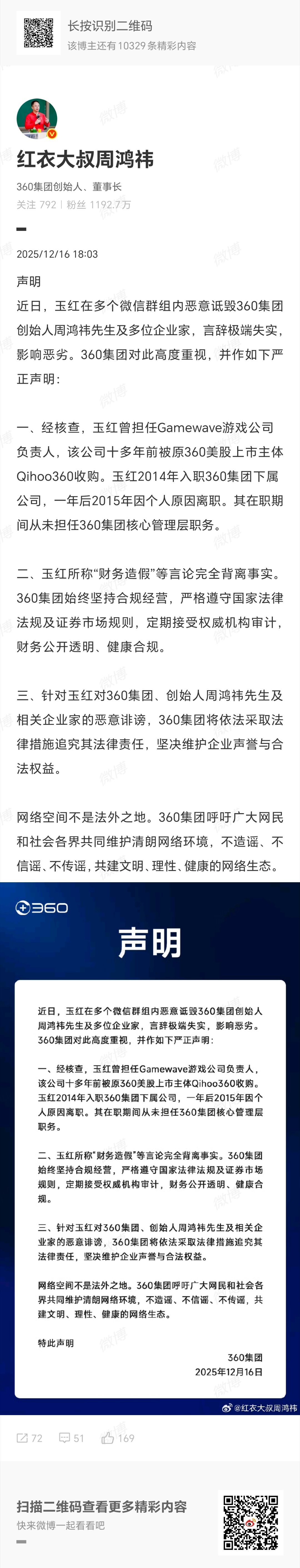 【#周鸿祎声明#】12月16日,发声明:“近日,玉红在多个微信群组内恶意诋毁360集团创始人周鸿祎先生及多位企业家,言辞极端失实,影响恶劣。360集团对此高度重视,并作如下严正声明:#周鸿祎否认财务造假#一、经核查,玉红曾担任Gamewave游戏公司负责人,该公司十多年前被原360美股上市主体Qihoo360收购。玉红2014年入职360集团下属公司,一年后2015年因个人原因离职。其在职期间从未担任360集团核心管理层职务。二、玉红所称“财务造假”等言论完全背离事实。360集团始终坚持合规经营,严格遵守国家法律法规及证券市场规则,定期接受权威机构审计,财务公开透明、健康合规。三、针对玉红对360集团、创始人周鸿祎先生及相关企业家的恶意诽谤,360集团将依法采取法律措施追究其法律责任,坚决维护企业声誉与合法权益。网络空间不是法外之地。360集团呼吁广大网民和社会各界共同维护清朗网络环境,不造谣、不信谣、不传谣,共建文明、理性、健康的网络生态。” #360将追究玉红法律责任#